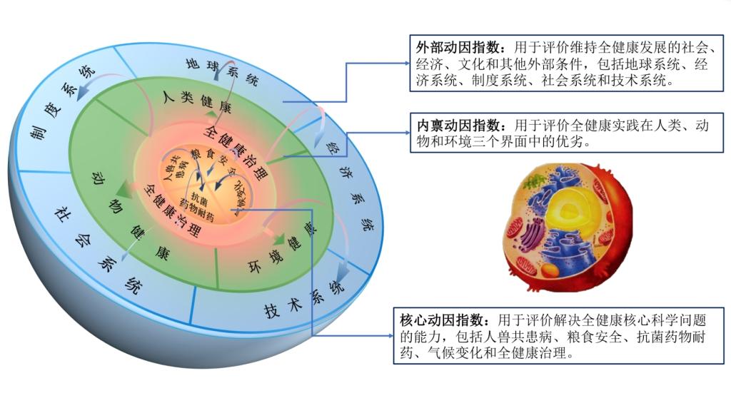 面向当前紧迫需求,上海交通大学医学院-国家热带病研究中心全球健康学院联合国内外多家单位,在向世界卫生组织、联合国粮农组织、世界银行、世界气象组织等国际组织专家的咨询与合作基础上,率先提出全健康细胞式评价框架。该框架由外部动因指数、内禀动因指数和核心动因指数等组成。其中核心动因指数包含了如何运用全健康理念、结合全健康治理手段解决新发和再发人兽共患病、抗菌药物耐药、粮食安全和气候变化所带来的健康问题。