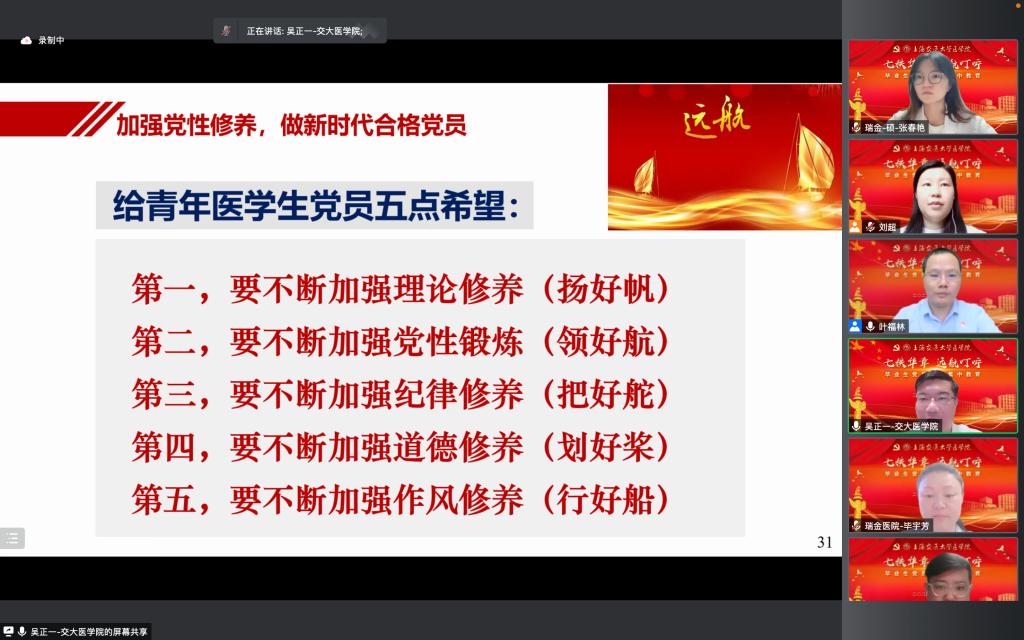 近日,上海交通大学医学院“七秩华章,远航叮咛”2022届毕业生党员离校以线上腾讯会议的方式在云端顺利举行。医学院党委常委、副院长吴正一作动员讲课,附属瑞金医院党委副书记、副院长毕宇芳作专题党课,会议由医学院党校副校长叶福林主持。近400名即将踏上工作岗位或继续求学深造的医学生党员学生在云端参加此次学习。