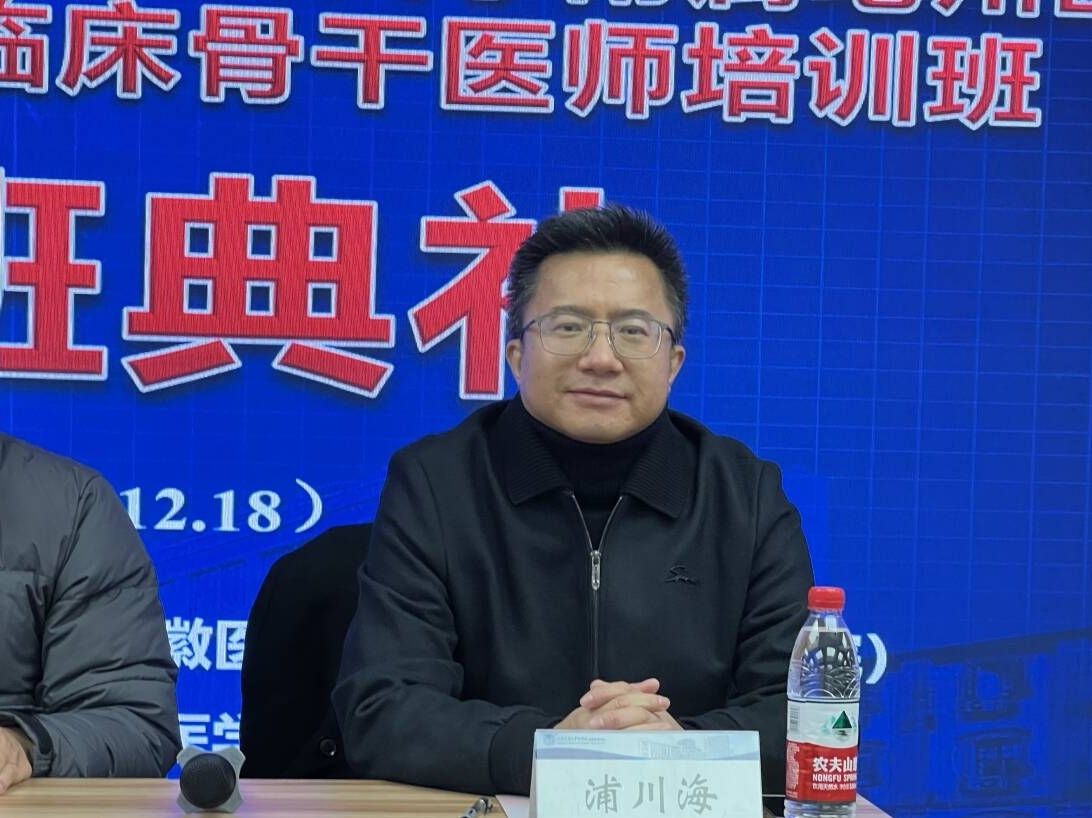 上海交通大学医学院继续教育学院党支部书记、副院长浦川海致欢迎词。他首先对远道而来的全体学员表示热烈欢迎,并对亳州市人民医院(安徽医科大学附属亳州医院)给予上海交通大学医学院的信任之情致以诚挚感谢。他向大家介绍了上海交通大学医学院的发展历程、学科现状以及医教研等方面取得的成绩。他表示,党的二十大报告中提出,要把人民的健康放在优先发展的战略地位。临床医生在医院的发展过程中占据举足轻重的地位,对临床医生的培训是推动医院高质量发展、保障人民健康的重要方面。本次培训班经过交大医学院和亳州市人民医院(安徽医科大学附属亳州医院)相关负责同志前期的深度调研,结合实际需求优化了课程结构,聘请了业内资深专家授课,在实践考察、教学服务等环节均全面提质升级,更加契合医院的培养需求。采用系统理论学习、案例分析、经验分享、讨论交流、临床实践等多种教学方式,为学员提供广阔的学习平台,解决现实工作中面临的困惑和挑战,更好地服务患者,推动医院高质量发展。