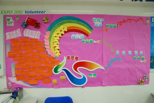 志愿者进入休息室,便发现了一张硕大的海报,首先映入眼帘的是那道亮丽的“彩虹”,它寓意着七彩炫丽的灿烂心情,这也是志愿者助手们对“小白菜”的深情寄托,希望在他们的心中没有阴天和雨天,每天都有晴朗的心情。海报的左上角是一面鲜艳的五星红旗,让“小白菜”们时刻牢记自己身在世博会就犹如站在一个世界大舞台上,时刻展示着中国青年志愿者的形象,自己的一举一动都将备受关注。红旗旁边还留有一块给“小白菜”记录每日心得的地方,供他们交流学习,共同把这份光荣的使命圆满完成。另有一处名为“交通之星”的光荣榜,将每天评出的“热心肠”、“百科全书”、“不倒翁”、“超级玛丽”、“大兵小将”等获奖志愿者公布出来,以此互相勉励。此外,墙上还贴有“文明观博,青年公约”的宣传海报和医高专的《世博有我》彩色专刊,让“小白菜”可以随时了解自己周围同伴的工作情况,感受到身边有那么多志同道合的伙伴和他们一样在为世博辛勤工作着。