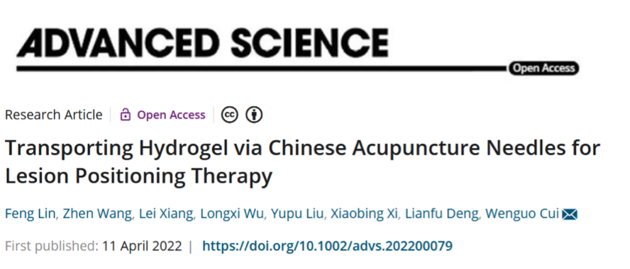近日,附属瑞金医院/上海市伤骨科研究所(上海市中西医结合防治骨与关节病损重点实验室)崔文国教授团队在Advanced Science上发表题为Transporting Hydrogel via Chinese Acupuncture Needles for Lesion Positioning Therapy的研究论文。该研究创新性的构建了“水凝胶-中国针灸”体系,利用中国传统针灸的优势微创精准突破体内物理屏障将水凝胶递送于病灶,并巧妙利用针灸尖端的螺纹结构成功将水凝胶留置于病灶内,通过水凝胶缓释药物实现精准的病灶定位治疗,也开启了中国针灸生物材料的研究。