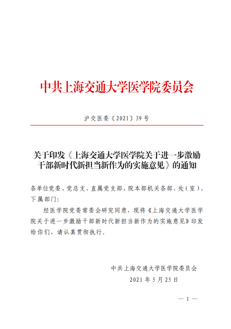 上海交通大学医学院关于进一步激励干部新时代新担当新作为的实施意见
