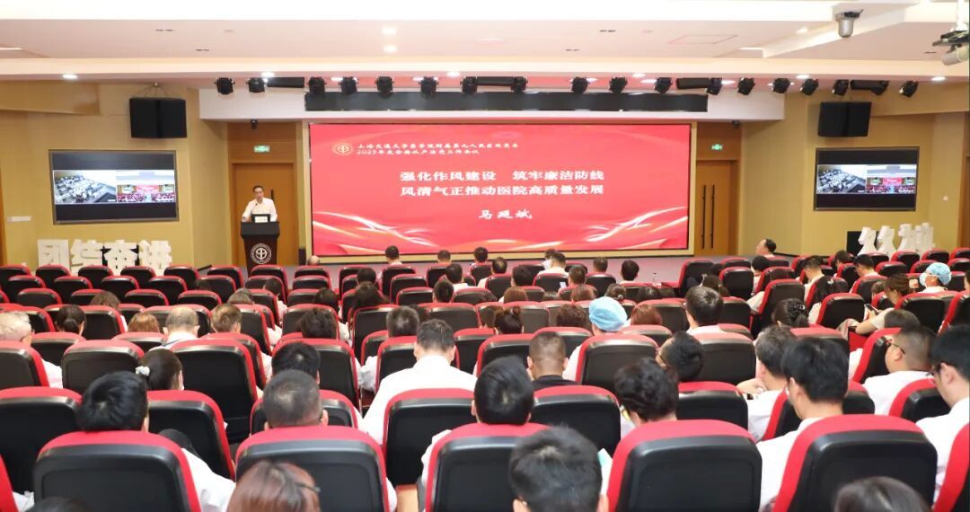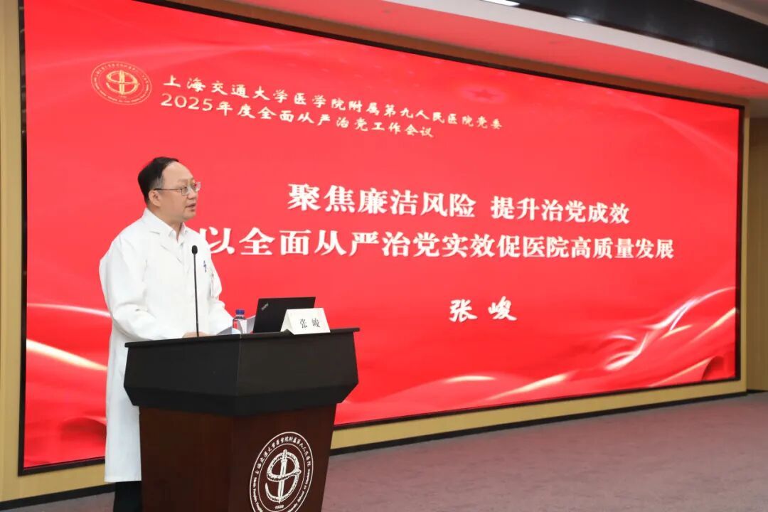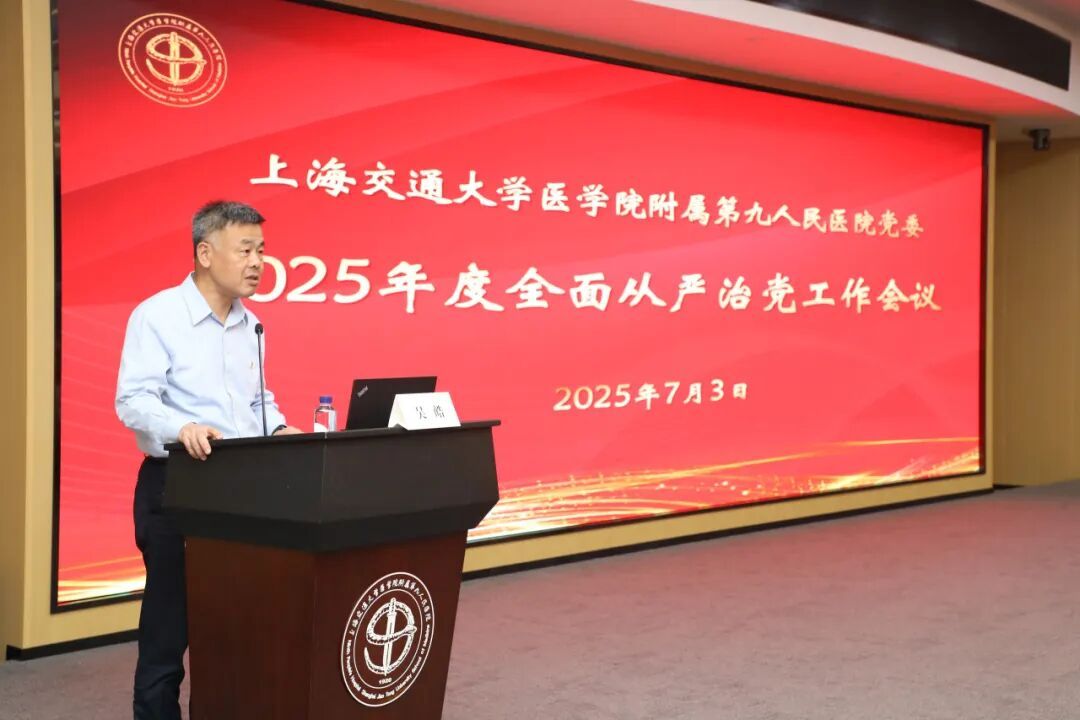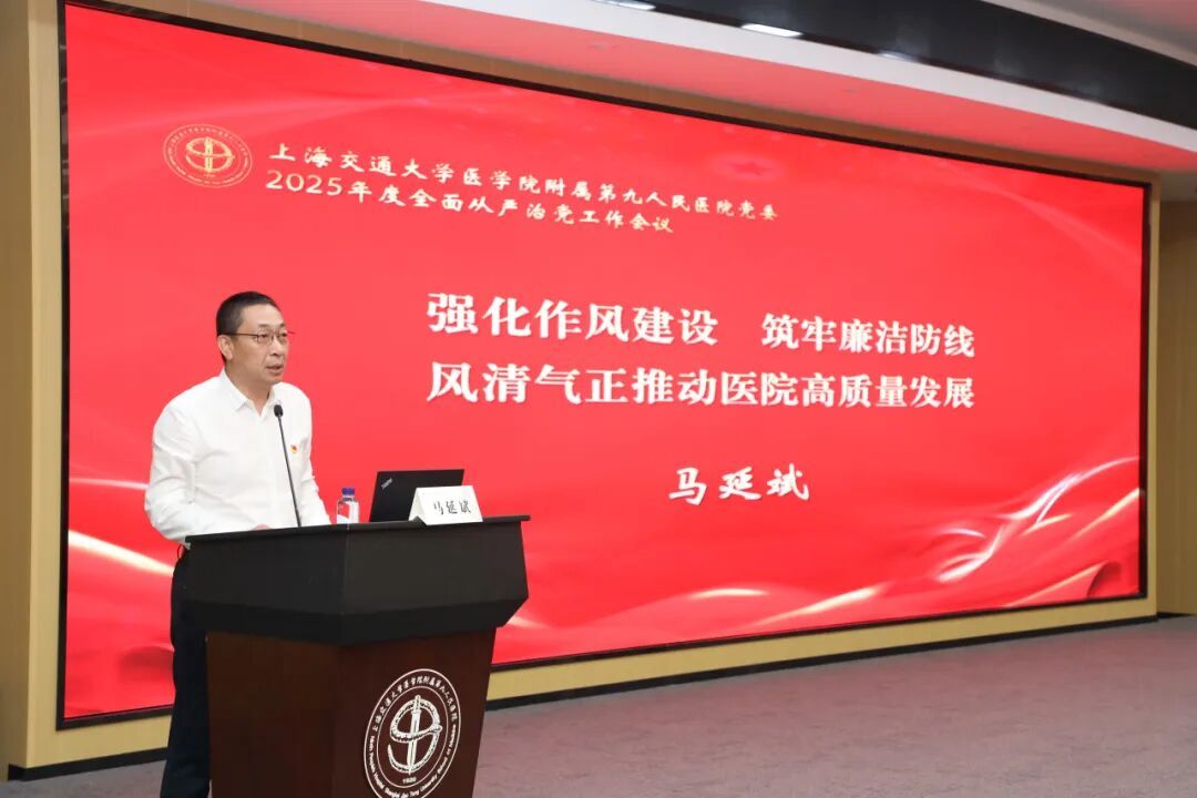 7月3日下午,为深入学习贯彻习近平总书记关于加强党的作风建设的重要指示批示精神及二十届中央纪委四次全会和十二届市纪委四次全会精神,落实市教卫系统和交大医学院全面从严治党工作会议工作部署,院党委召开2025年度全面从严治党工作会议。党委书记马延斌通报部署第九人民医院党委全面从严治党及深入贯彻中央八项规定精神学习教育工作情况,党委副书记、纪委书记张峻作医院党风廉政建设工作报告,党委委员、副院长王旭东作医院行风建设工作报告。医院党政领导班子成员、全体党支部书记、职能部门负责人、科主任、护士长、新提任干部、年轻干部、重点岗位工作人员、党支部组织委员、纪检委员、党外人士代表等参加会议。党委副书记、院长吴皓主持会议。