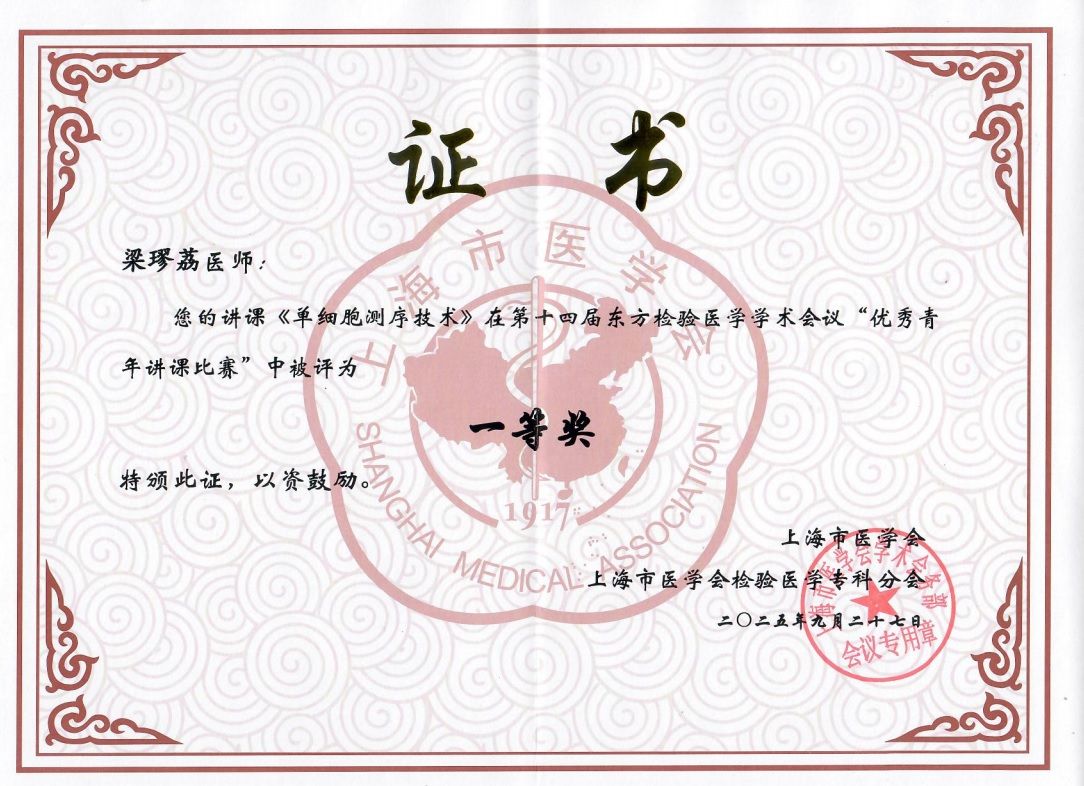 在9月25日举办的“第十四届东方检验医学学术会议——青年讲课比赛”中,上海交通大学医学院医学技术学院医学检验技术系的梁璆荔老师凭借其精彩的讲课表现位列第一名,荣获大赛“一等奖”
