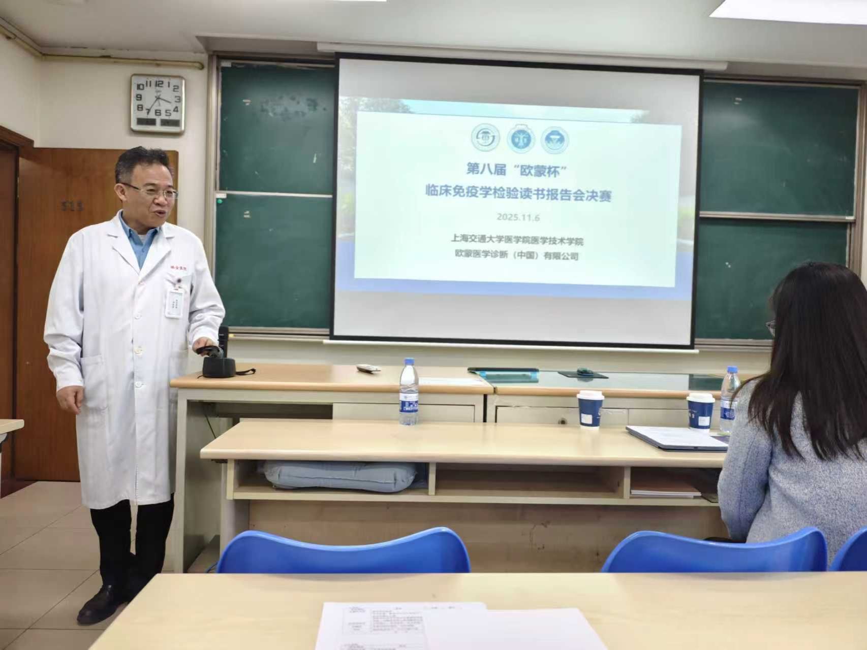 2025年11月6日下午,上海交通大学医学院医学技术学院医学检验技术系与欧蒙医学诊断(中国)有限公司联合举办的第八届“欧蒙杯”临床免疫学检验读书报告会决赛在学院内顺利举行。来自医学检验技术和医学检验技术(法语班)的12名同学,在上学期的初赛中脱颖而出,成功晋级本次决赛。活动特邀上海交通大学医学院医学检验系倪培华老师、欧蒙医学诊断(中国)有限公司付婉蓉老师、李擎天老师和黄洁雯老师担任评委嘉宾,与现场师生共同见证这场精彩纷呈的学术盛宴。