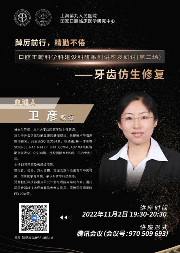 2022年以来,上海九院口腔正畸科和口腔正畸党支部积极探索支部的基层党建活动和学科建设融合创新方式,构建双月学科建设和思政系列讲座,活动截至目前已经连续举办了九场,邀请来自四川大学华西口腔医学院,北京大学口腔医学院,浙江大学口腔医学院,南京医科大学口腔医学院,斯坦福大学医学院等国内外著名院校的国家杰青,国家优青等国家级四青高层次人才,分享口腔医学的前沿进展和科学研究的成功经历,讲座内容丰富多元,聚焦牙颌面组织损伤修复和仿生修复,粘接材料,神经系统组织工程,口腔正畸学术期刊发展,细胞命运和矿化相关疾病等。