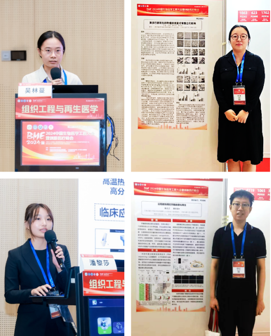 蒋欣泉教授作为分会场主席,于大会同期成功举办了中国生物医学工程学会组织工程与再生医学分会场会议。分会场汇聚了来自全国近200人参会,邀请到特邀报告及口头报告48人,壁报展示60余人。此次分会场会议聚焦组织工程与再生医学技术,从新材料研发与材料改性、机制探索、临床转化应用等多个方面探讨了目前再生医学领域的最新进展和发展方向,来自我国组织工程与再生医学领域的专家、学者及备受瞩目的国家杰青、优青等青年才俊们,大家齐聚一堂,畅所欲言、交流思想、启迪思路、共谋创新,推动了中国组织工程与再生医学领域基础研究和临床应用转化的蓬勃发展。口腔医学院曹玲燕副研究员代表蒋欣泉教授分享了口腔颌面部软硬组织再生修复新策略及临床转化应用;张文杰教授重点阐述了口腔颌面部组织再生的血管化调控方案;张骞骞老师分享了关于口腔抑菌材料及机制的探究工作;研究生吴林蔓、潘黎莎分别进行了关于血管化骨再生和种植体表面改性的最新研究进展口头报告;口腔修复科郑奥医生和杨光正医生也进行了关于骨整合及骨再生研究的壁报展示。