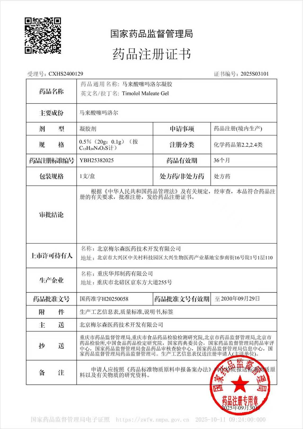9 月 30 日,上海交通大学医学院附属第九人民医院郑家伟教授团队与北京梅尔森医药技术开发有限公司共同合作并自主研发的儿童专用新药“贝美净”(通用名:马来酸噻吗洛尔凝胶)正式获得国家药品监督管理局(NMPA)批准上市。作为全球首个获批用于治疗增殖期浅表性婴儿血管瘤的外用凝胶制剂,该药物的问世不仅终结了该疾病领域 “无外用药可用” 的现状,更标志着我国在该领域创新药研发领域取得了重大进展。