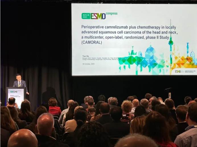 10月18日,全球肿瘤学界的年度盛会——欧洲肿瘤内科学会(ESMO)大会在德国柏林隆重召开。会上,我院口腔颌面头颈肿瘤科何悦教授团队以大会口头报告形式,重磅公布CAMORAL研究成果,凭借突破性疗效数据,引发全球肿瘤领域专家学者高度关注与热烈讨论。该研究首次证实围手术期卡瑞利珠单抗联合化疗可显著改善可切除局部晚期头颈部鳞状细胞癌患者的无事件生存期(EFS),为这类临床治疗困境较大的患者带来全新治疗选择,彰显中国头颈肿瘤研究的国际影响力。