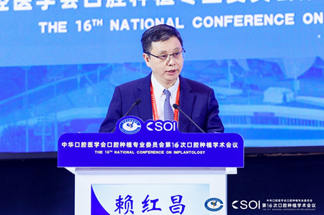 中华口腔医学会口腔种植专业委员会主任委员、我院口腔种植科主任赖红昌教授作为本次大会主席,作主题演讲——《口腔种植学科发展60年:历史与展望》。他以历史视角为轴线,带领全体参会者穿越半个多世纪的学科演进长河,系统梳理了口腔种植从早期探索、理论奠基到技术突破、临床普及的关键节点。从Brånemark教授提出“骨结合”理论的革命性时刻,到数字化技术重塑现代种植范式,既有对前辈开拓精神的深切致敬,也有对中国种植发展历程的深刻洞察。他特别指出,中国口腔种植事业在过去三十年间实现了从“跟跑”到“并跑”,并在部分领域迈向“领跑”的跨越式发展。这一成就离不开一代代临床工作者的坚守与创新,也得益于学术体系的不断完善与国际交流的持续深化。面向未来,他展望了智能化诊疗、生物材料革新、个性化再生医学等前沿方向,呼吁行业同仁在传承中守正,在创新中突破,“以临床需求为原点,以科学精神为灯塔”,共同书写下一个六十年的辉煌篇章。