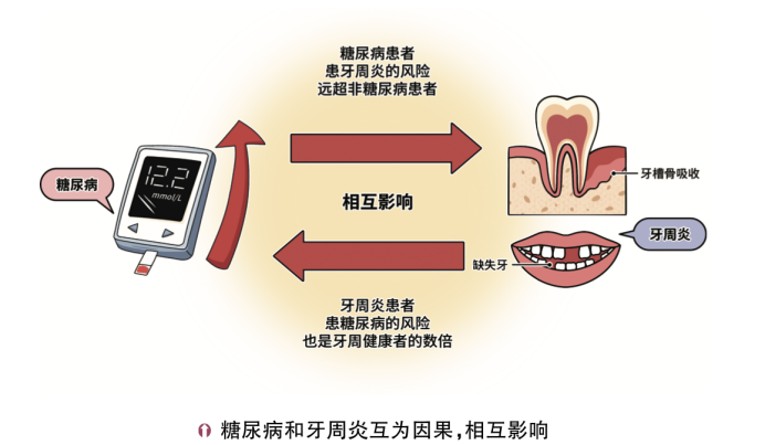 糖尿病和牙周炎是互相影响、双向作用的两种疾病。研究表明,牙周炎患者的血糖控制水平比牙周健康人群更差,如空腹血糖、糖化血红蛋白和胰岛素抵抗指数都显著增高,因此牙周炎患者中同时患有糖尿病的比例更高。与之相应的,糖尿病患者患有牙周炎的风险更高,他们的牙周健康状况也更差。因此,牙周炎患者要特别关注自己血糖的变化,糖尿病患者也要注意自己的牙周情况。