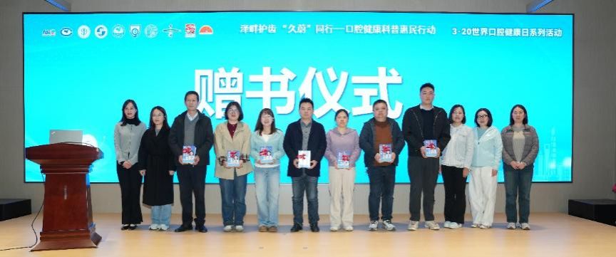 在全场嘉宾的共同见证下,徐袁瑾书记与叶丽君镇长共同为“久蔚”诊室公益项目揭牌,现场同步播放“久蔚”诊室宣传片,全面展现该项目扎根基层、服务群众的核心定位。随后的赠书仪式上,我院专家团队向金泽镇岑卜村、育田村、淀湖村等7个村居委书记,赠送了《口腔自我保健视频漫画丛书》及《“糖友”