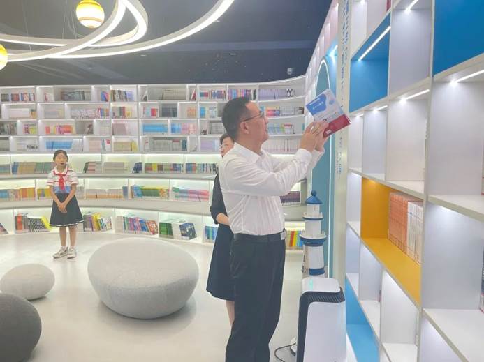 ▲ 参加活动的各位领导嘉宾共同参观附属浦东实验小学北校,深入了解合作共建后,小学北校进行的一系列特色改造,包括“懿源湾”图书馆、师生艺术长廊、苹果之谜探究坊、智慧之花文化墙、海蓝星乐园等。