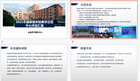各实训中心负责人分别介绍了各自的临床教学经验、取得的成果及下一阶段发展规划。瑞金实训中心从示范作用、教育教学改革、队伍建设、经费支持等方面做了总结分享;仁济实训中心就开展的培训班、培训课程、动物模拟手术等特色项目进行了介绍;九院实训中心在虚拟仿真项目建设、人才培养等方面与其他中心进行交流;新华实训中心、市一实训中心、市六实训中心也分别在师资培训、课程建设、人才培养成效等方面做了展示。
