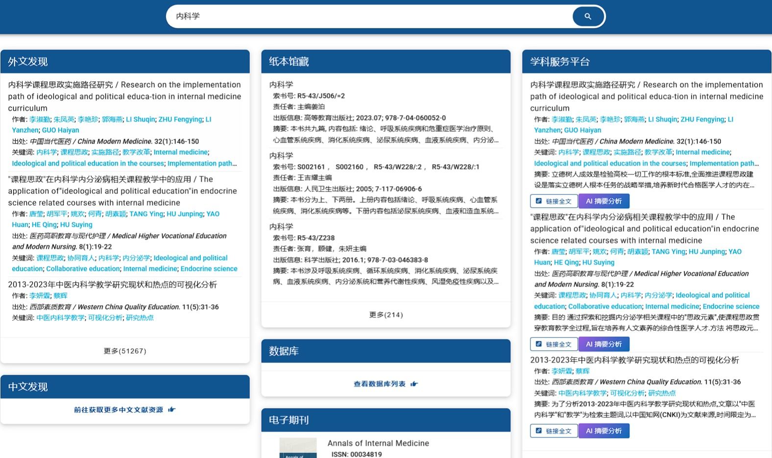 新增BentoBox风格的统一检索功能,支持同时对馆藏目录、中外文发现系统、数据库、电子期刊等多种资源进行一站式检索,无需切换页面,极大提升检索效率!不论您要找图书、论文,还是专业数据库内容,只需输入一次关键词,精彩尽收眼底。更有强大的学科服务平台功能等您探索: