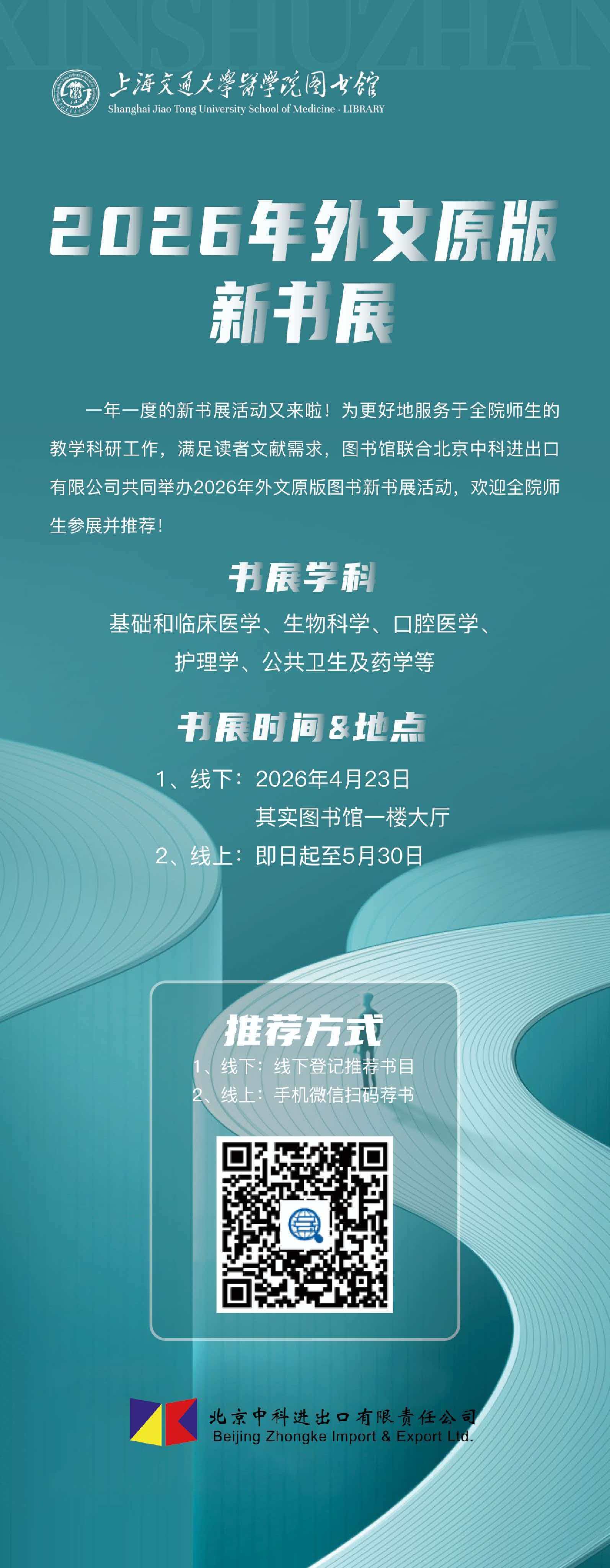一年一度的新书展活动又来啦!为更好地服务于全院师生的教学科研工作,满足读者文献需求,图书馆联合北京中科进出口有限公司共同举办2026年外文原版图书新书展活动,欢迎全院师生参展并推荐!