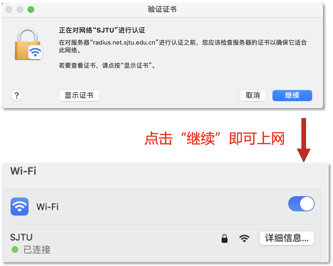 3)若您的终端设备是苹果macOS系统,请您在终端设备弹出“验证证书”窗口后,点击“继续”按钮: