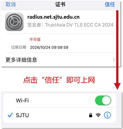 4)若您的终端设备是苹果iOS系统,请您在终端设备弹出“证书”窗口后,点击“信任”按钮: