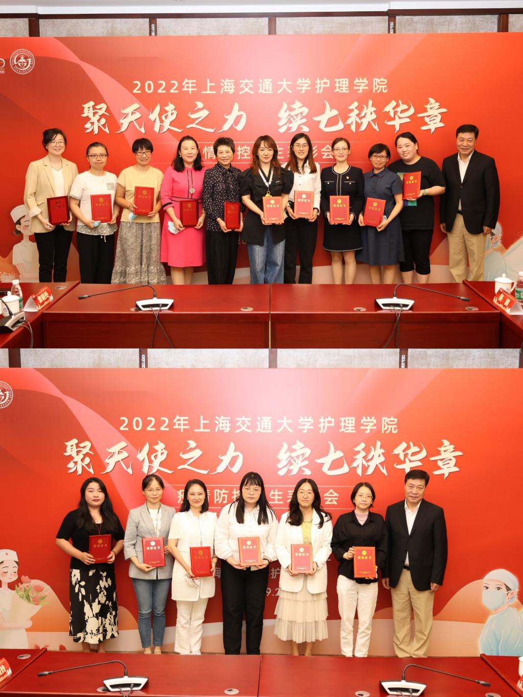 以陶幸娟老师为代表的16位护理学院教师以及22位护理学生志愿者们在大上海保卫战的关键时刻,积极响应学校号召,挺身而出,他们舍小家、为大家,一帧帧防控工作视频画面正是“党有号召,使命必达”的真实写照。会上,方琼副院长宣读了“2022年护理学院疫情防控志愿者教师表彰名单”以及“2022年护理学院学生志愿者表彰名单”,方勇副院长和章新书记分别为受表彰的教师和学生颁发纪念证书。
