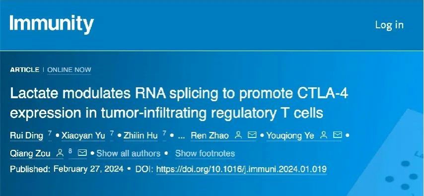 Immunity | 邹强课题组等揭示乳酸介导CTLA-4的RNA剪接以维持Treg细胞免疫抑制功能的机制