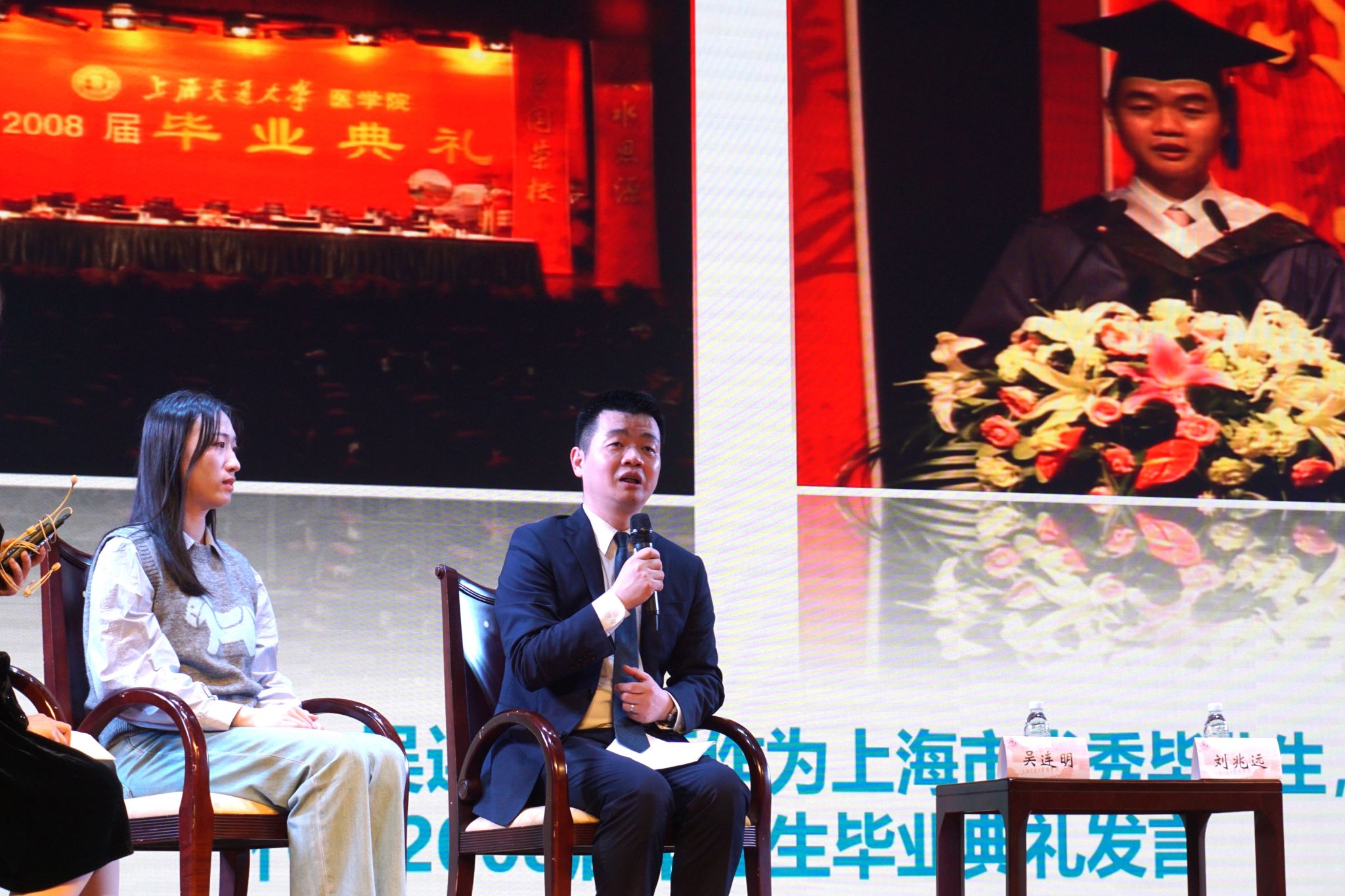 为深入学习贯彻习近平新时代中国特色社会主义思想和党的二十大精神,落实立德树人根本任务,4月23日晚,由院本部研究生团委主办、新生研究生会承办的“医心聚萤火 青春谱华彩”优秀青年导师朋辈分享会在医学院懿德楼三楼大礼堂顺利举办。附属仁济医院放射科主任医师、博士生导师吴连明及其学生余凌艺,基础医学院免疫学研究所课题组长、博士生导师刘兆远及其学生朱忆文共聚一堂,畅谈白袍青春。学指委副秘书长、研究生党总支书记郭莹莹,以及近五百名研究生及辅导员代表出席此次活动,活动由2023级内科学直博生许琼元主持。