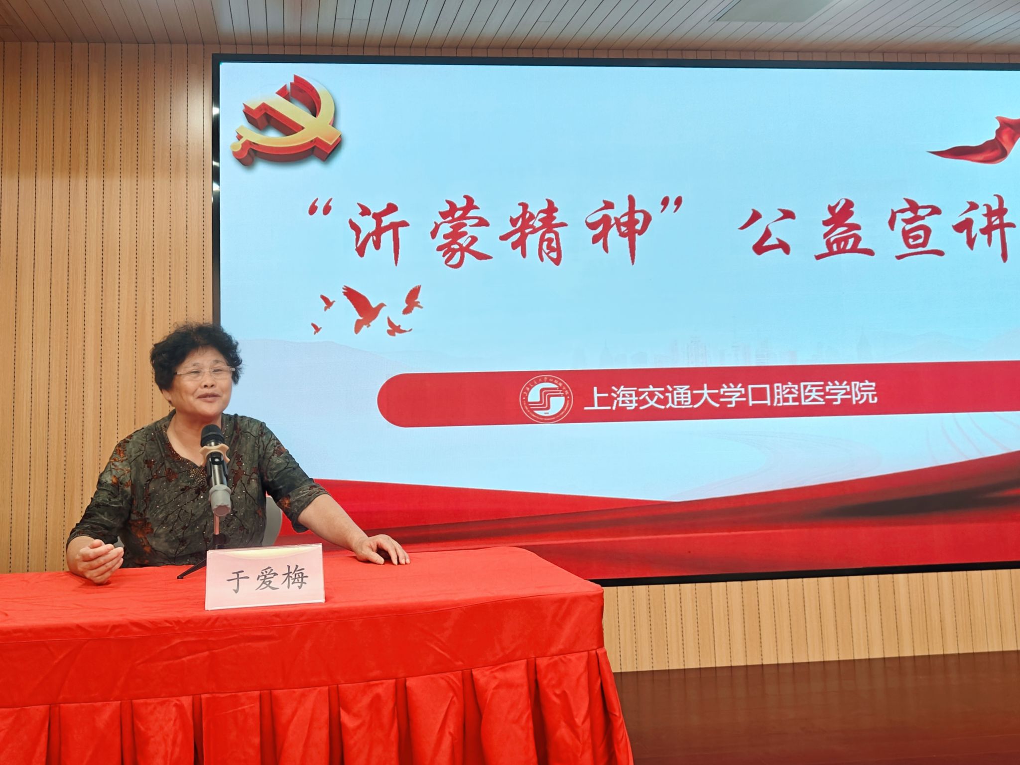 2013年11月,习近平总书记在临沂考察时指出:“沂蒙精神与延安精神、井冈山精神、西柏坡精神一样,是党和国家的宝贵精神财富,要不断结合新的时代条件发扬光大。”2024年9月9日,沂蒙精神传承促进会会长于爱梅老师走进上海进行公益宣讲。10日中午,于老师应邀前来上海交通大学口腔医学院为师生宣讲,活动由口腔医学院党委副书记郑家伟主持。