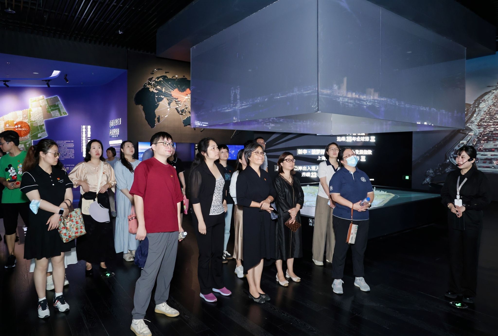 活动伊始,工青妇党支部、教务处党支部全体党员一起参观了浦东城市规划和公共艺术中心。作为一个集规划展示、公共艺术、科普教育、会议举办和文化创意等多功能于一体的城市公共活动空间,浦东城市规划和公共艺术中心近5000平方米的展陈面积,讲述了横跨1210平方公里的浦东新区的发展历程、建设成果与未来蓝图。其中,“地球之眼”通过裸眼3D球形屏幕,让大家从宇宙视角俯瞰,领略浦东日新月异的变化;在BOX空间互动殿堂,科技与艺术的完美结合使得每一步行走都能激活地面的粒子效果,光影莫测,引领大家进入一个全新的视觉体验维度。这里全面展示了浦东立足新发展阶段、贯彻新发展理念、构建新发展格局呈现出的“全球典范、璀璨明珠”的城市形象和建设开放、创新、高品质的卓越浦东的愿景目标。