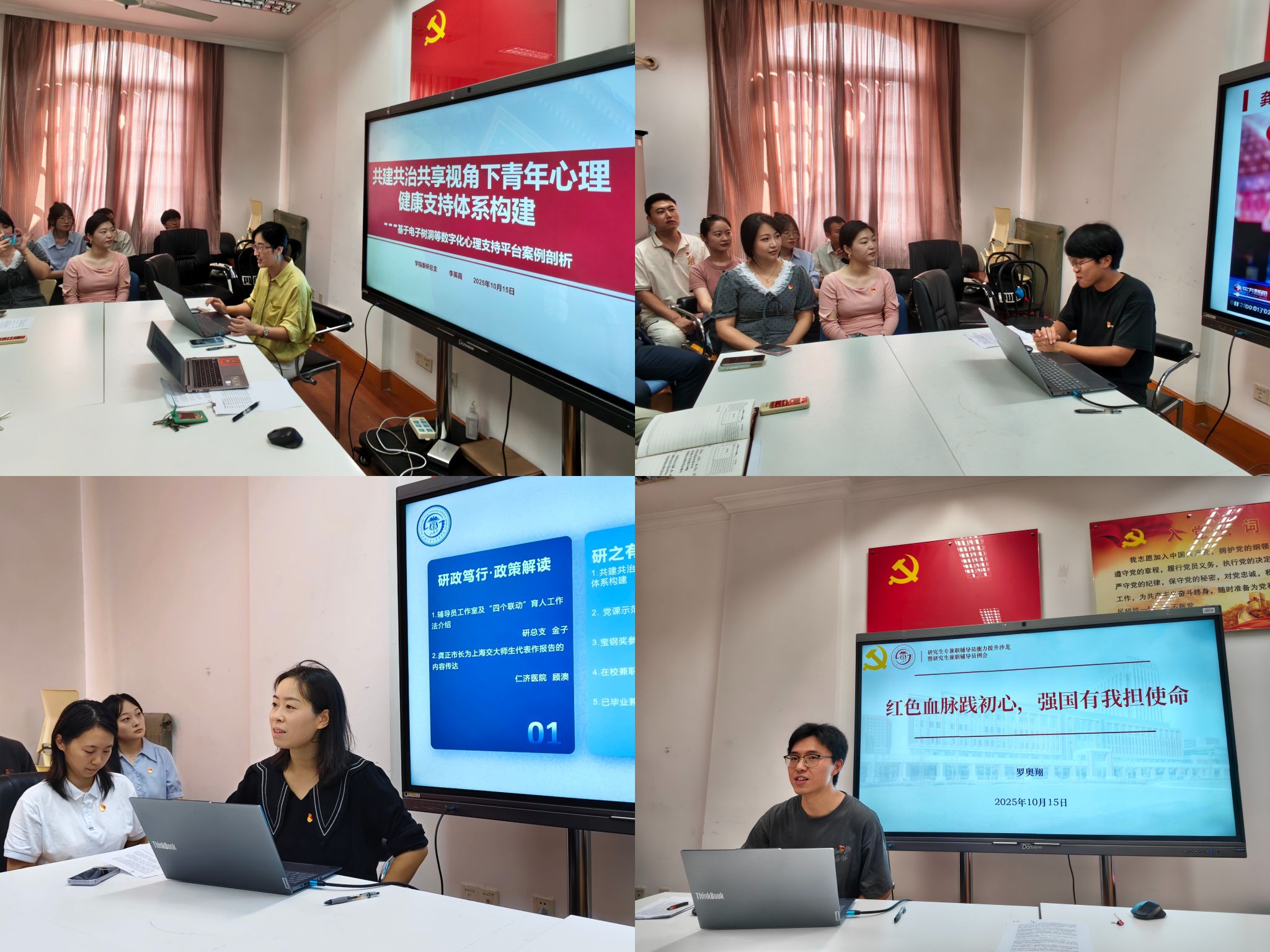在“研学互鉴”环节,各专兼职辅导员依次交流近期工作。附属瑞金医院林莉亚、仁济医院赖俊亮、新华医院邓雨欣、第一人民医院江菁、第六人民医院阮泽松及研总支兼职辅导员舒雅文、姜汶伶分别围绕院区搬迁、班委选拔、党员教育、评奖评优、心理健康等主题,分享“小老师、大同学”角色的实践案例与思考。大家一致认为,兼职辅导员需在日常工作中主动提炼育人价值,通过专业化、个性化服务增强思政工作实效。专职辅导员梁燕、曹峻盛在交流中充分肯定兼职辅导员的桥梁作用,强调专兼职队伍在政策传达、党建创新、学风建设、心理支持等领域深化协作,并就后续工作进行沟通。