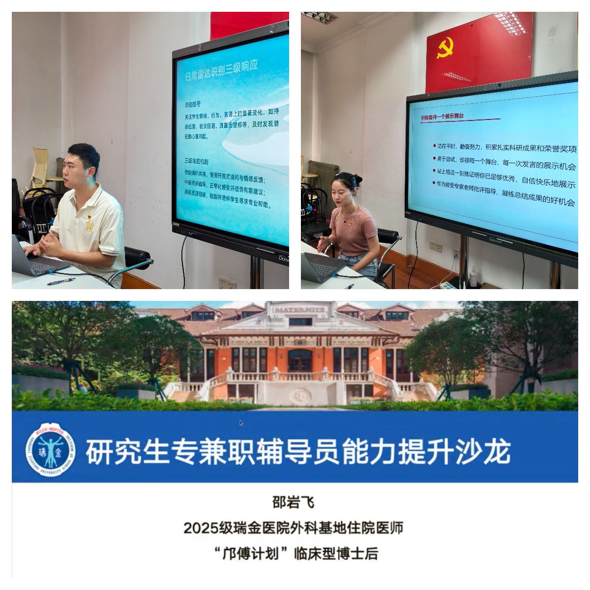 “研政笃行”环节,金子回顾了医学院研究生兼职辅导员制度自2013年起的发展迭代历程,重点介绍“四个联动”研究生兼职辅导员育人工作法的申报背景与实践成效,并指出兼职辅导员需在科研、临床与思政工作等多元角色中找准定位,成为“懂专业、懂青年、懂思政”的复合型人才。近期,市委副书记、市长龚正在上海交通大学为师生代表作形势与政策报告。附属仁济医院兼职辅导员、2025级外科学博士生顾澳作为现场参会学生代表传达龚正市长报告精神,并结合自身胰腺癌耐药机制研究,分享对上海“五个中心”建设蓝图及生物医药产业前景的思考,指出青年学生应将个人成长与国家战略、城市发展紧密结合,日常工作中则应思考基础科研如何向临床转化。