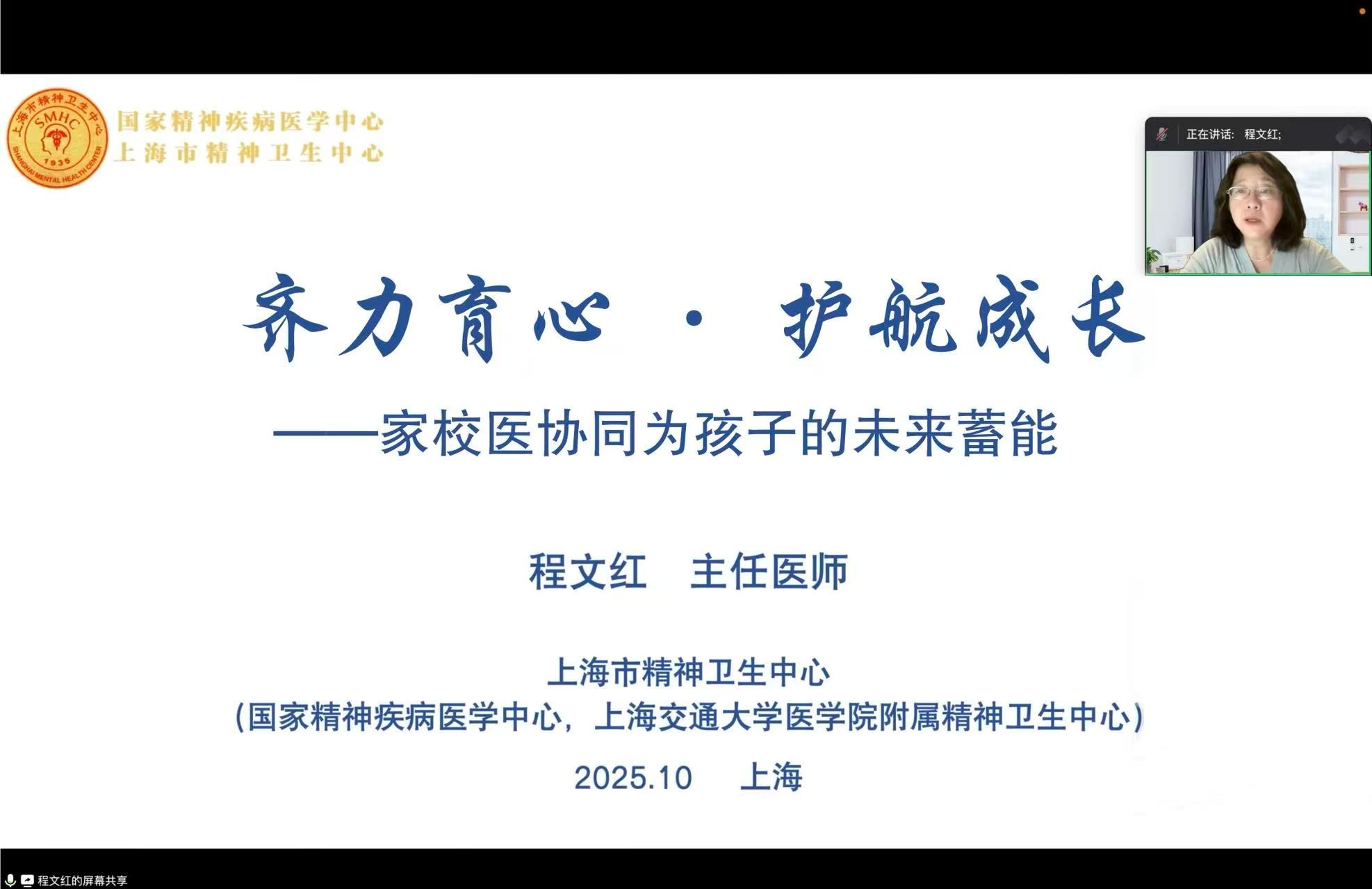 为推进医教结合、家校协同育人工作,上海交通大学医学院心理咨询中心、上海中医药大学心理咨询与发展中心于10月14日联合举办了主题为“齐力育心、护航成长--家校医协同为孩子的未来蓄能”的线上讲座。活动特邀附属精神卫生中心儿少心理科主任程文红担任讲座嘉宾,由医学院心理咨询中心主任王芳主持,近300名家长在线参与讲座。