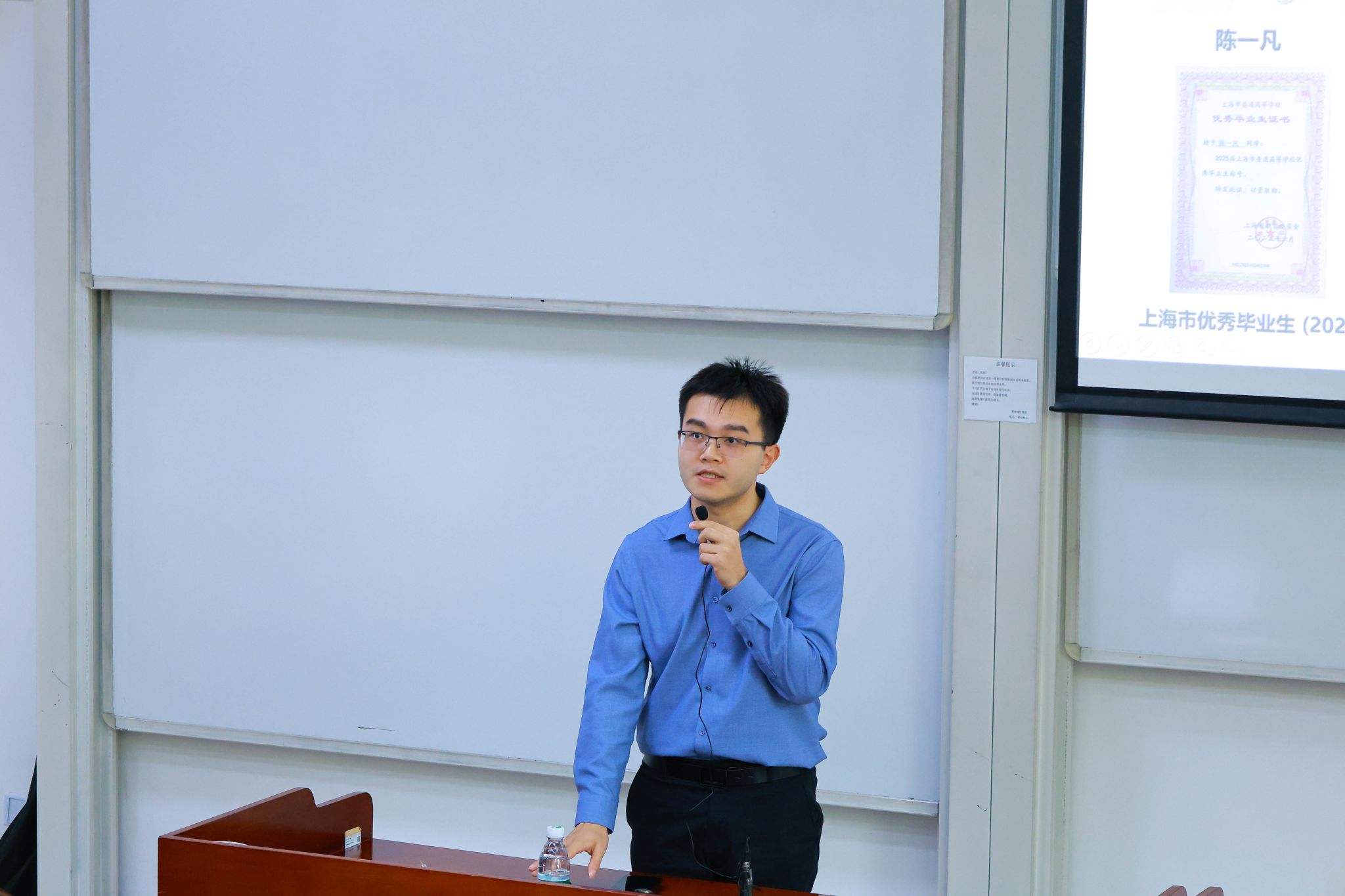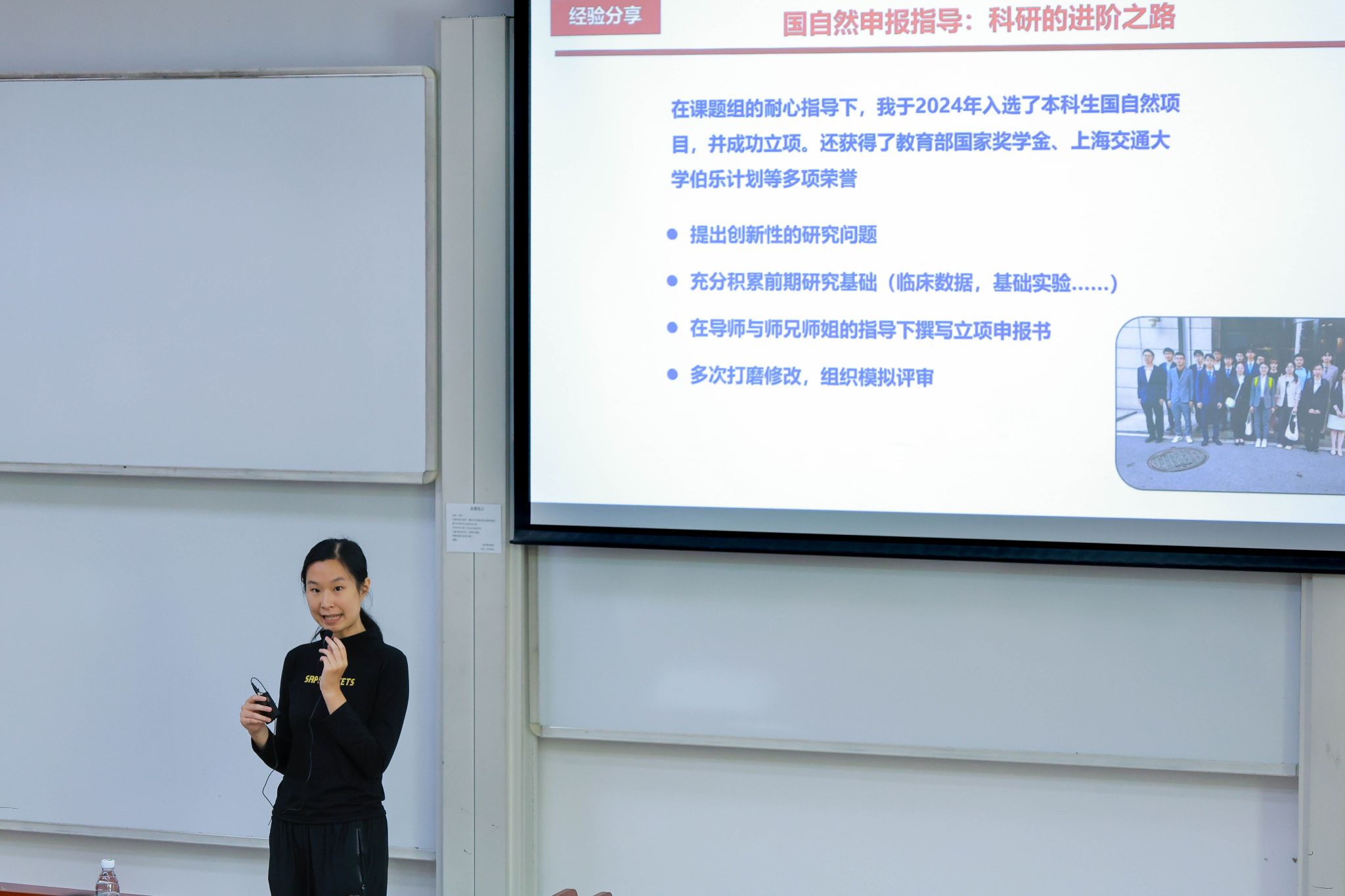 作为获得宝钢教育奖优秀学生奖的本科生,钟伊明介绍了自己在卜军教授团队里的成长历程。她以“精准破题,高效深耕”为主题,分享了自己作为本科生,如何在医学求学道路上开拓视野和不断创新的心得体会,特别是介绍了如何在导师指导与自身努力下逐步确立科研方向,获得本科生国家自然科学基金、上海市挑战杯竞赛一等奖的经验。她指出,首先是要保持一颗好奇心,明确方向、锚定兴趣,才能在不断追踪学科前沿的过程中实现真正的突破。她还总结了自创的“快—慢—快”文献阅读法:初读快速搭建核心框架,再读深入钻研关键细节,复盘时精准梳理逻辑脉络;同时,她还建议同学们借助专业文献管理软件,提升资料整理与知识积累的效率。针对新时代医学的发展趋势,她谈到跨学科融合已成为医学科研的重要创新驱动力,Python等编程技能也已成为必备工具,并且勉励同学们积极运用新一代人工智能技术赋能科研创新,持续提升自身的科研思维与创新能力。