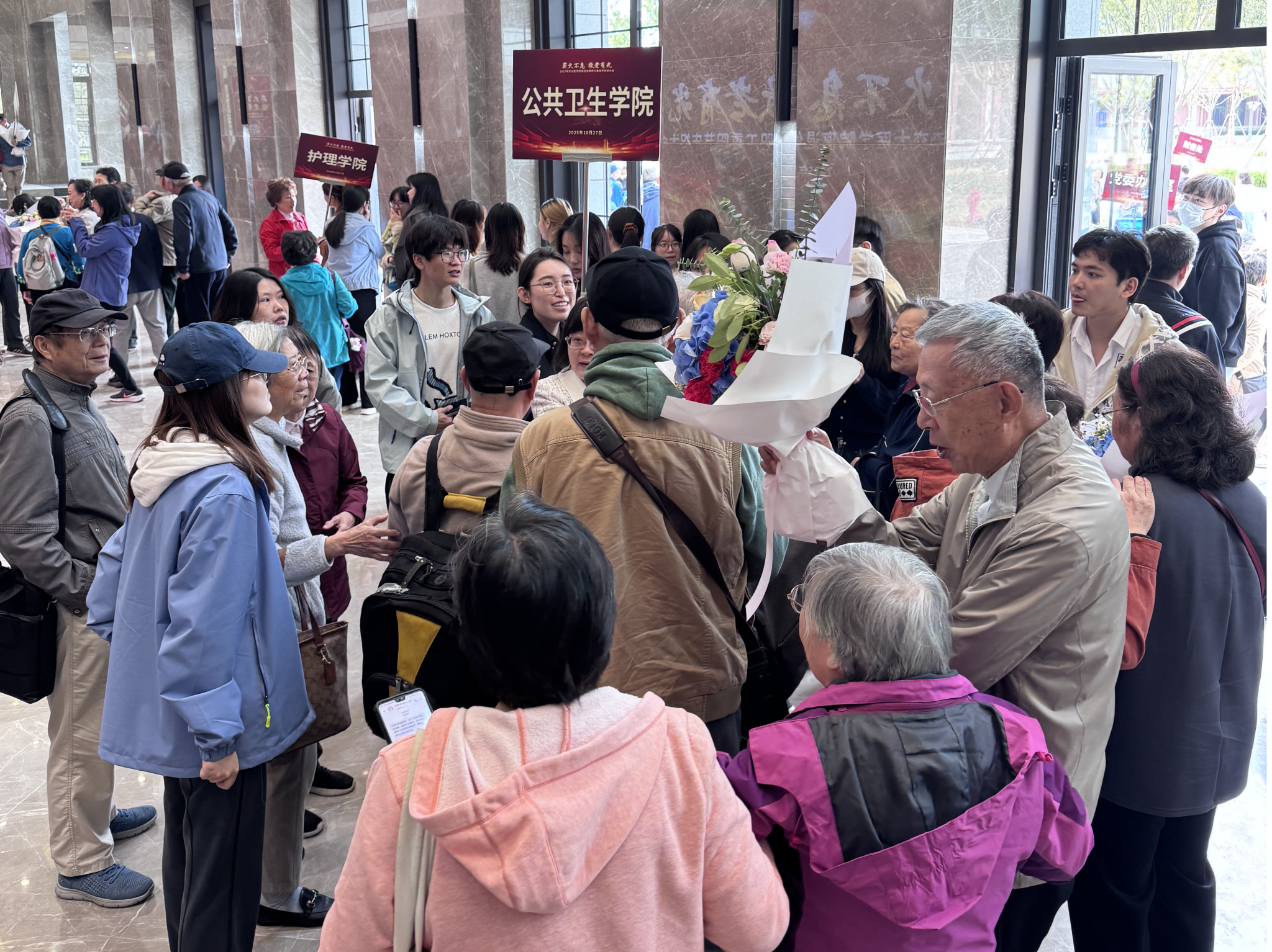 中午时分,学院师生志愿者早早来到会场,热情迎接返校的老教授、老前辈们。青年学生主动引导、陪同,细致周到地为老同志们提供服务。从签到到入座就餐,从交流到合影,整个迎宾过程温馨感人,展现了公卫学子尊师重道、敬老爱老的良好风貌。