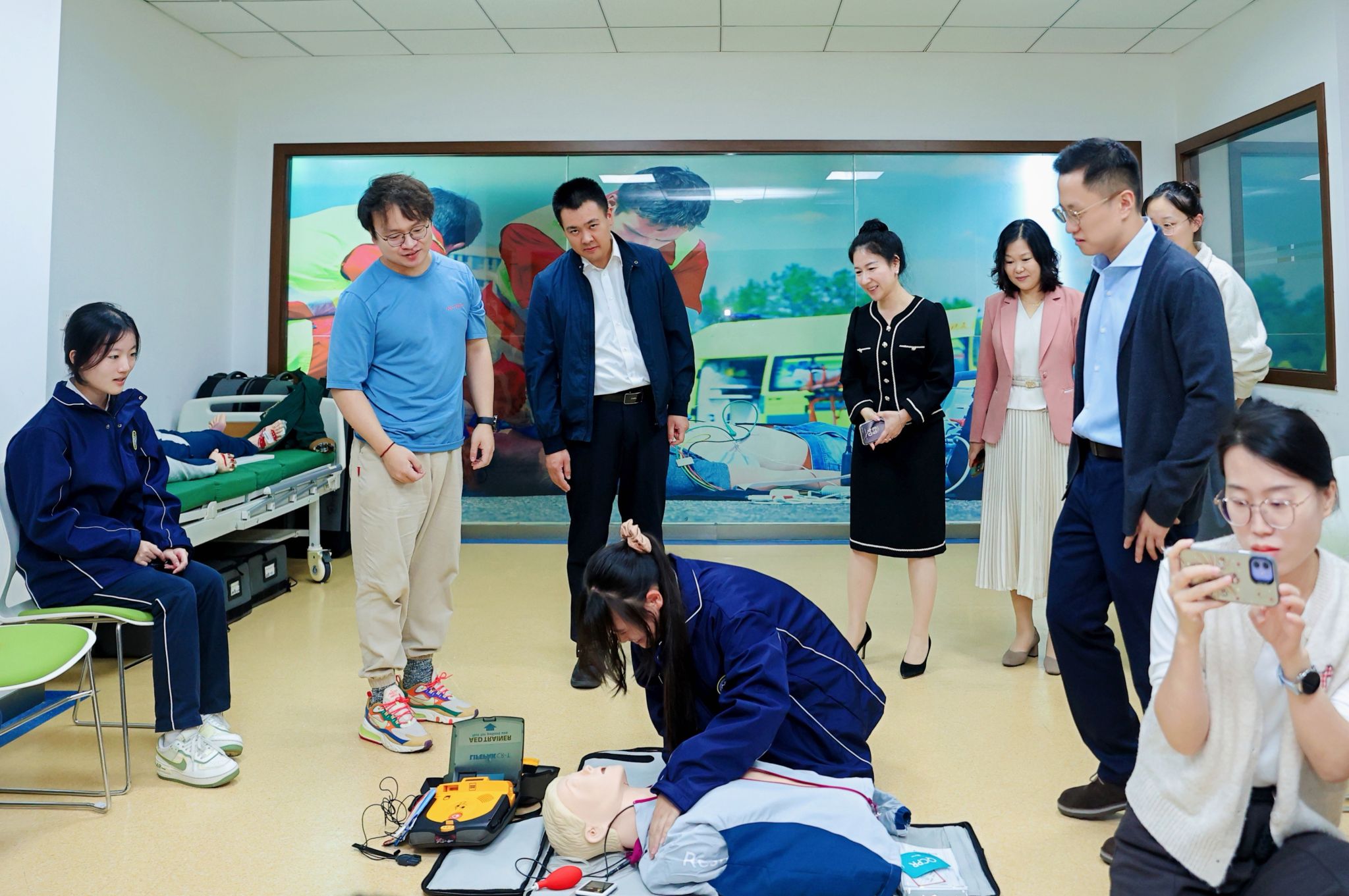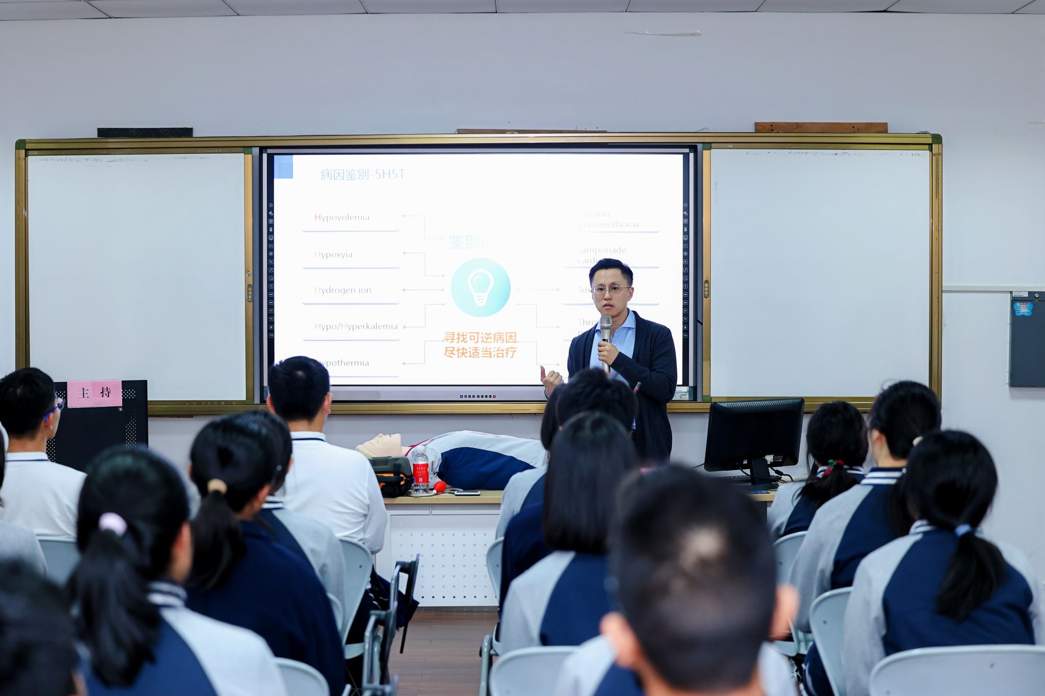 当天,来自闵行中学的30名学生代表赴闵行区急救“拯救者联盟”基地参加“行走的健康大思政课”首讲。课堂上,附属瑞金医院急诊科副主任医师、上海市第八批“组团式”援藏医疗队队员王义辉分享了缺氧不缺精神、艰苦不怕吃苦、海拔高境界更高的援建感悟,以精准施救、分秒必争的急救精神,在生与死的考验中践行让患者“躺着进来,走着出去”的初心使命。在助教和急救中心老师的指导下,学生们分组开展急救实操演练,在动手实践中掌握关键技能,深刻理解“生命至上”的理念。