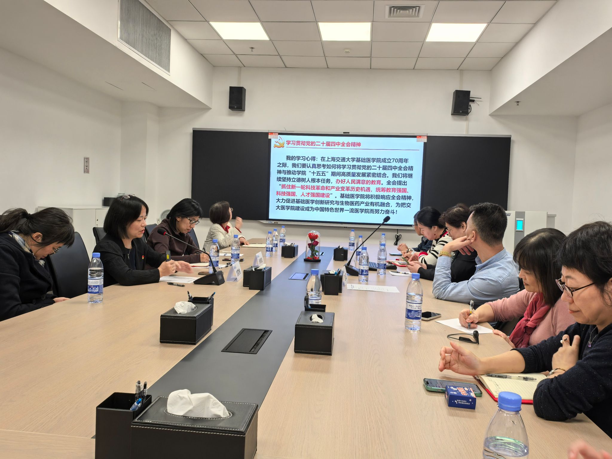 随后,童雪梅围绕学习党的二十届四中全会精神,结合有力推进基础医学院纳入“立德树人机制综合改革上海市试点院系建设”试点单位谈学习体会。具体介绍了学院在创新医学人才培养机制中的探索与成果,强调要办好人民满意的教育,以高质量党建引领育人机制创新,推动教育、科技、人才“三位一体”协同发展。实验教学中心支部书记许伟榕就新校区实验教学中心的建设成效与未来规划做分享。孟诚卫董事长从自身成长,由医学生、基础医学院教师到生物技术产业人的蜕变,分享了心路历程,从生物技术产品“能用、好用、爱用”到“从仿制到创造到被仿制”谈道路自信与创新发展,强调了产教协同共育人才的重要作用。交流环节,张晓波介绍了师生参观基础医学院刘俊岭教授的循耀生物医药公司的体会,表示基础医学院党委要以试点院系建设为抓手,推广产业导师,建立产业化赋能的基础医学人才建设机制。缪青分享了大学生创新训练工作方面今后构想,通过课程-实践-科创贯通衔接、院-校-医-企资源有机协同,培养面向新质生产力发展方向的复合型医学创新人才。参会支部书记就充分发挥浦东区位优势,推动校企共建、培养新时代医学创新人才开展热烈讨论。(图3、图4)