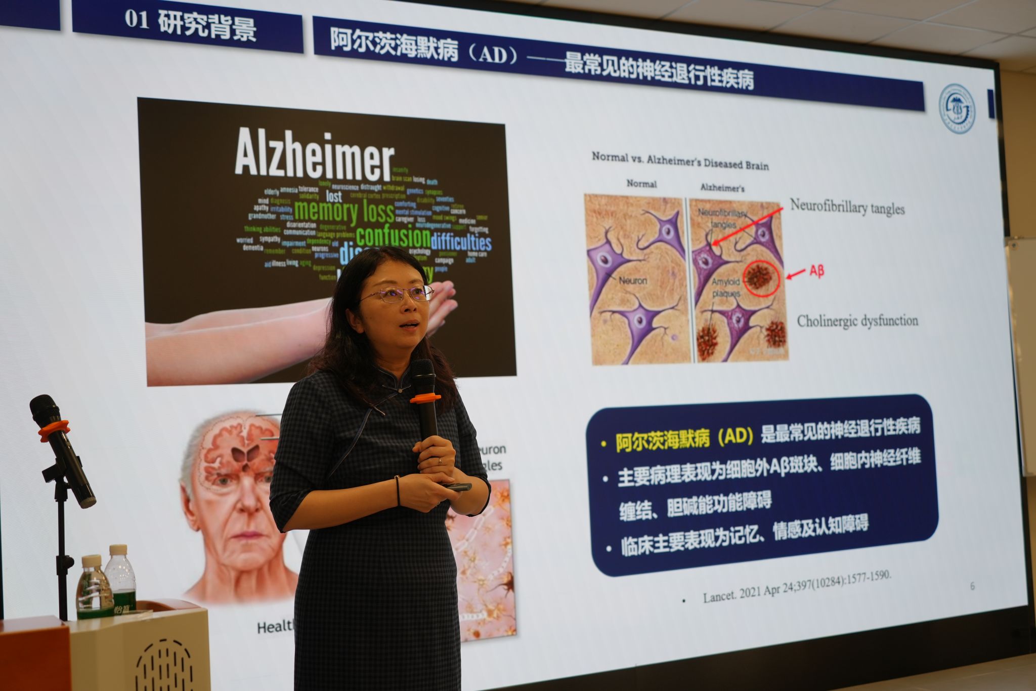 王昊以“阿尔茨海默病神经血管单元调控新机制及中药干预研究”为题作专题报告。她从阿尔茨海默病的血管病理机制出发,系统介绍了神经血管单元在疾病发展中的关键作用,并分享了团队在抗体药物研发与中药干预方面的创新探索。她强调,科研应“以临床需求为导向”,注重从基础到应用的转化路径,并鼓励学生“追逐科学前沿、学习人工智能、勇于沟通交流”,树立高远理想,为推动中国科学发展贡献力量。
