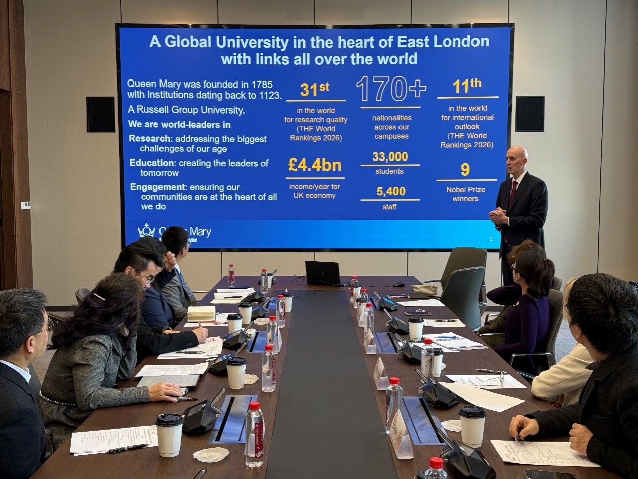 11月19日,伦敦玛丽女王大学(Queen Mary University of London)全球事务总监Lee Wildman先生,市场营销、学生招生与教育普及总监Elvie-Jo Shergold女士,东亚地区主管Patty Wang女士,以及InterGreat教育集团首席执行官Olivia Bo女士等一行访问上海交通大学医学院浦东校区。上海交通大学医学院党委副书记、副院长吴正一热情接待了代表团,双方就口腔医学合作、医疗体系经验共享、合作办学模式等议题展开深入交流。医学院国际交流处、教务处、研究生院、口腔医学院等相关负责人参加会见。