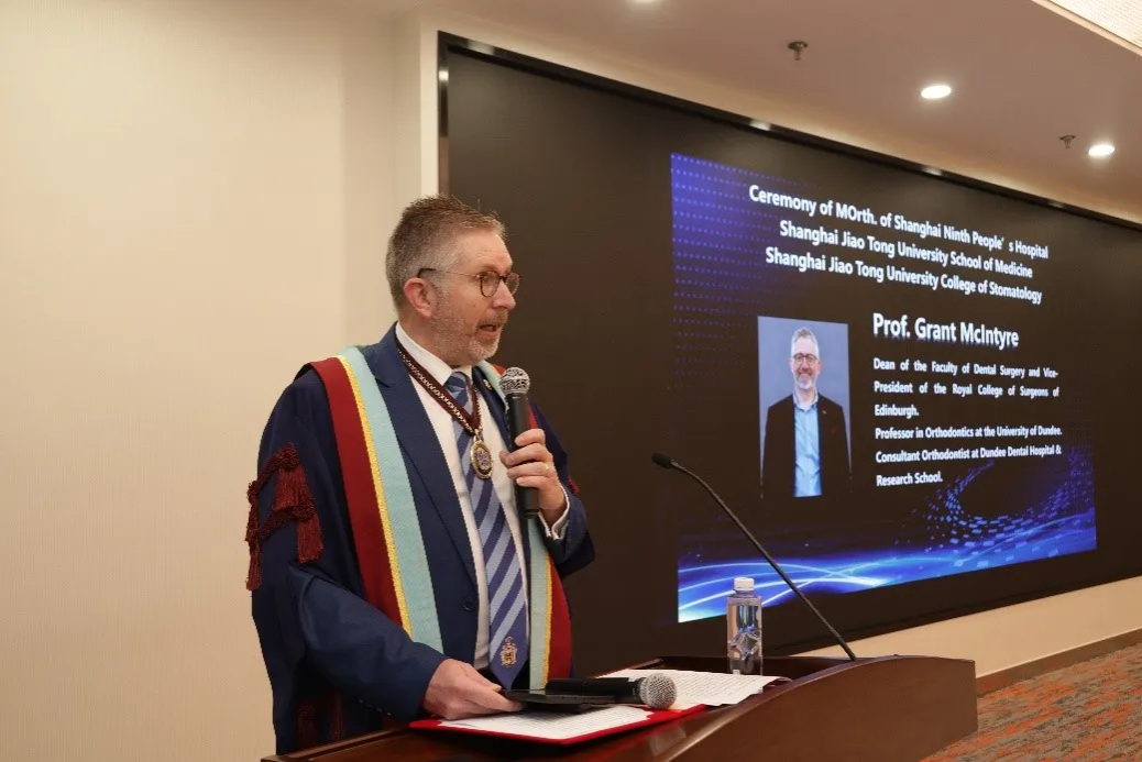 此次颁证仪式由中国工程院院士张志愿教授、上海交通大学医学院附属第九人民医院院长吴皓教授、上海交通大学口腔医学院党委书记徐袁瑾教授、英国爱丁堡皇家外科学院/口腔医学院院长Grant McIntyre教授、口腔医学院口腔正畸临床文凭培训中心主任房兵教授、以及来自英国及本院的口腔正畸考官团队共同见证这一具有里程碑意义的时刻。张志愿院士和吴皓院长在致辞中强调,口腔医学院将持续深化与英国爱丁堡皇家外科学院等国际顶尖机构的合作,积极参与全球口腔正畸教育治理,推动中国标准、中国方案走向世界。此举不仅是口腔医学院落实国家教育对外开放与“健康中国”战略的具体行动,也是推动医学教育从“跟跑”到“并跑”至“领跑”的重要体现,为构建人类卫生健康共同体贡献中国智慧与力量。