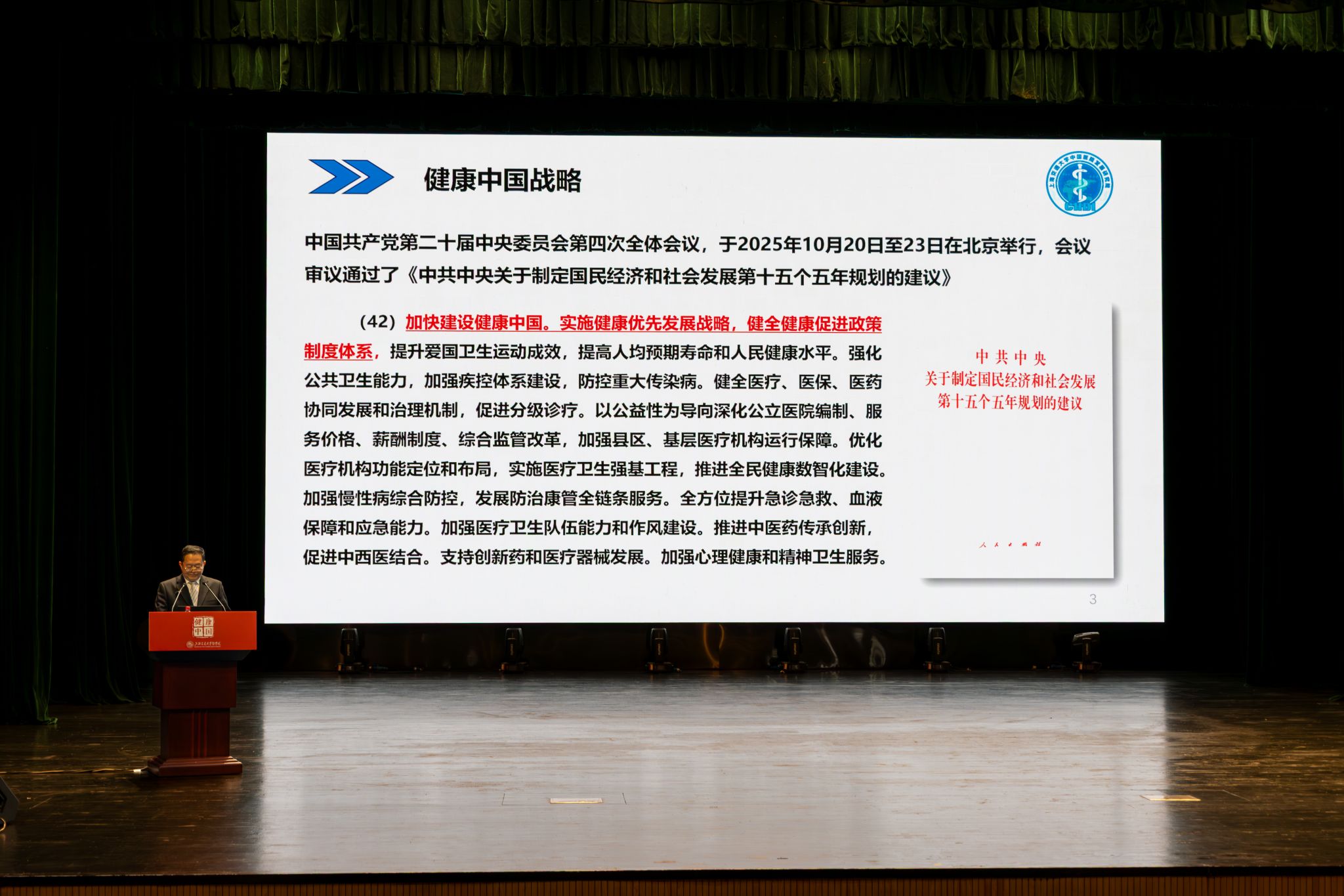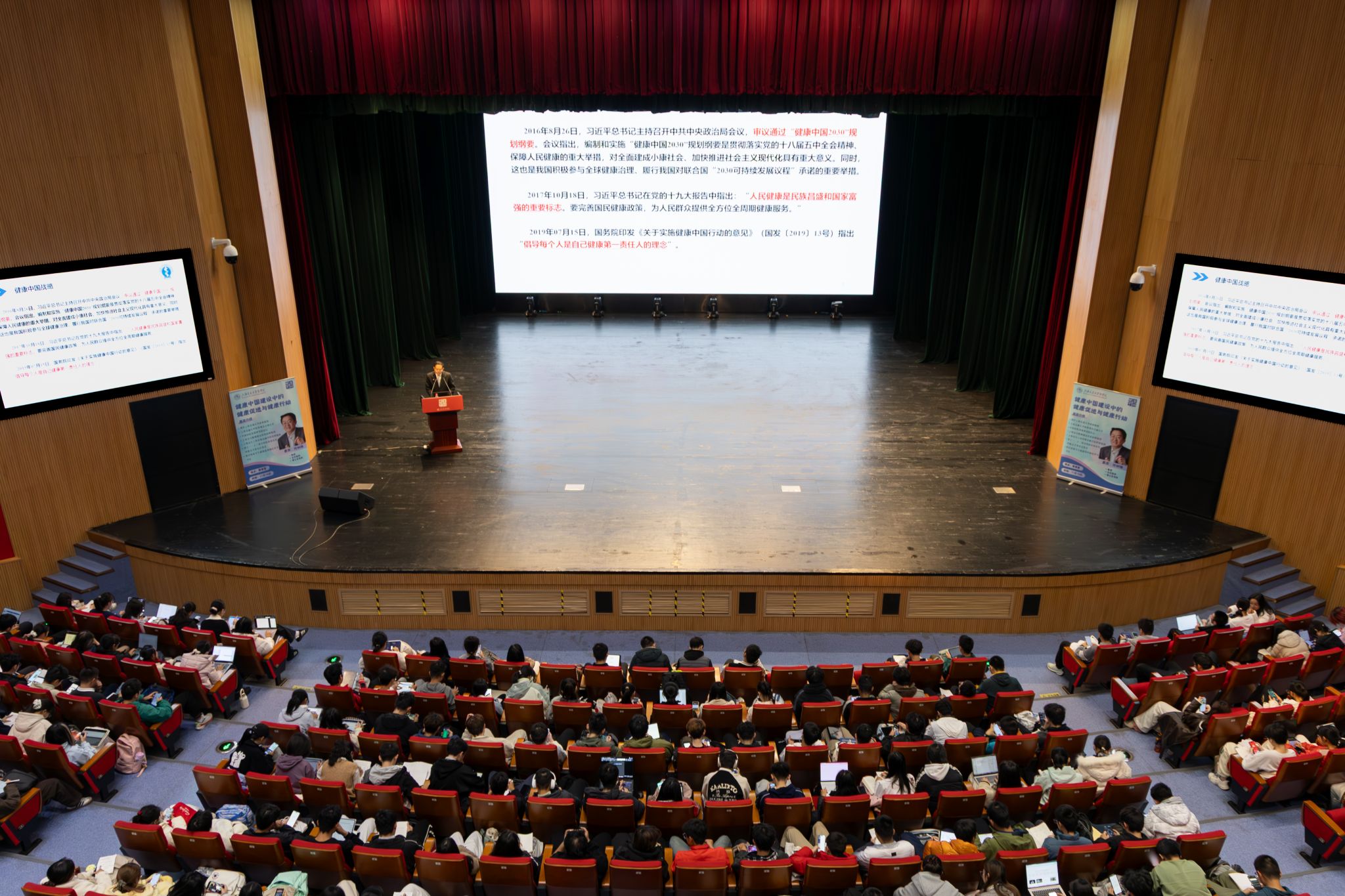 11月29日下午,上海交通大学讲席教授、上海交通大学校务委员会副主任、中国医院发展研究院院长许树强教授,在闵行校区菁菁堂为2025级1000余名医学本科生带来思政大课,以《健康中国建设中的健康促进与健康行动》为题,围绕战略演进、健康促进内涵、行动体系、主动健康与数字化赋能四大板块,解析“以治病为中心”向“以人民健康为中心”的转型逻辑。
