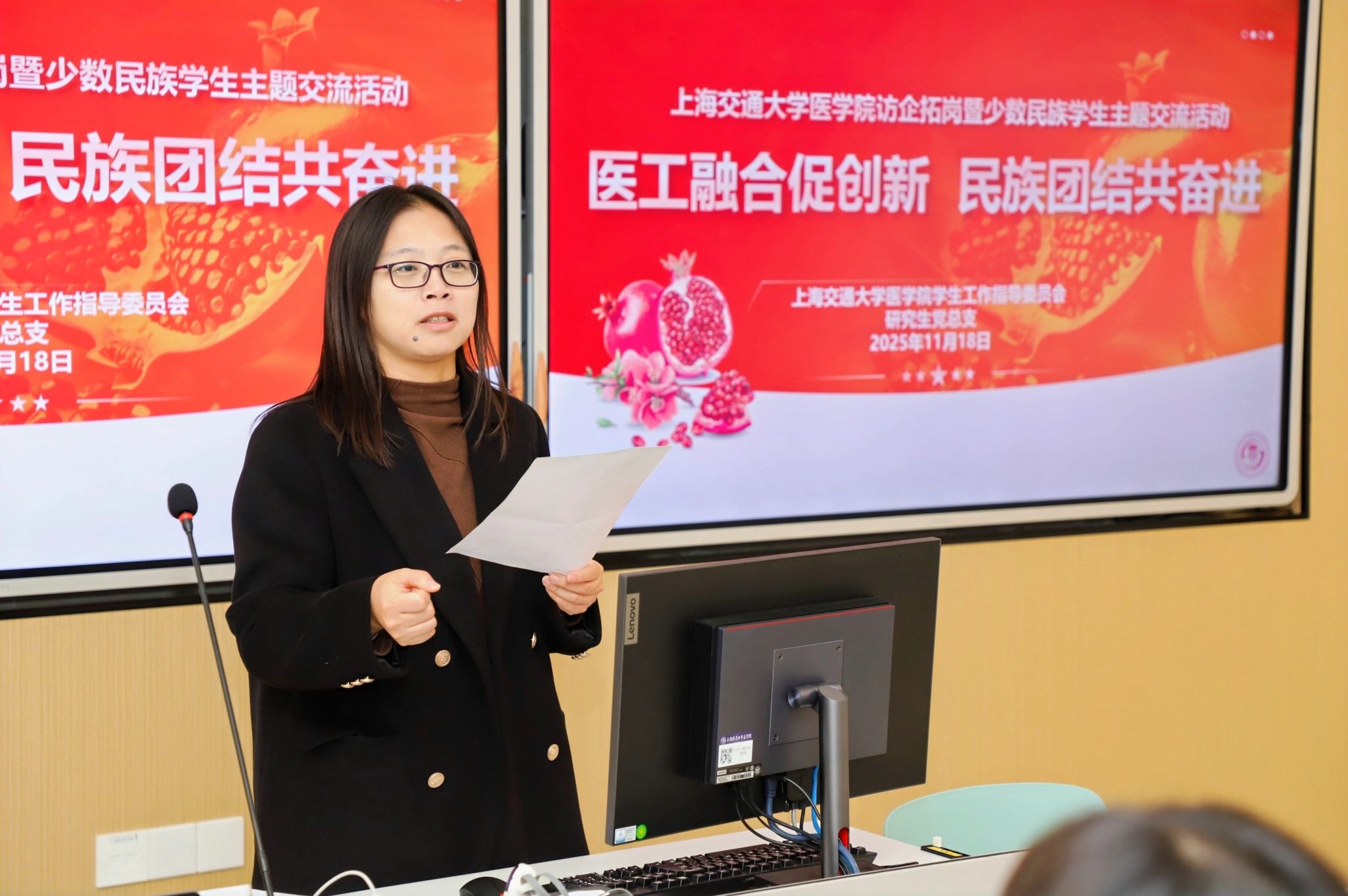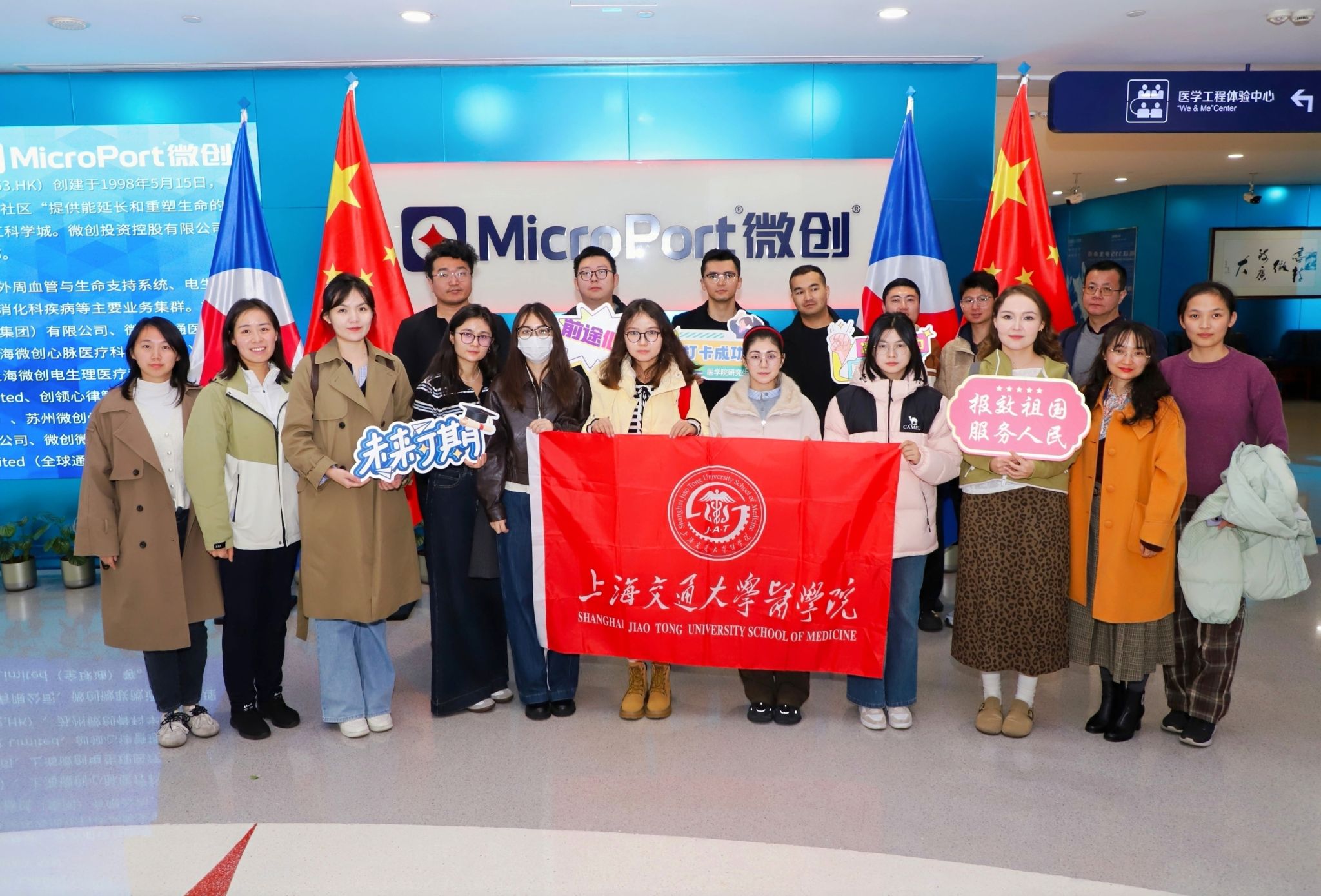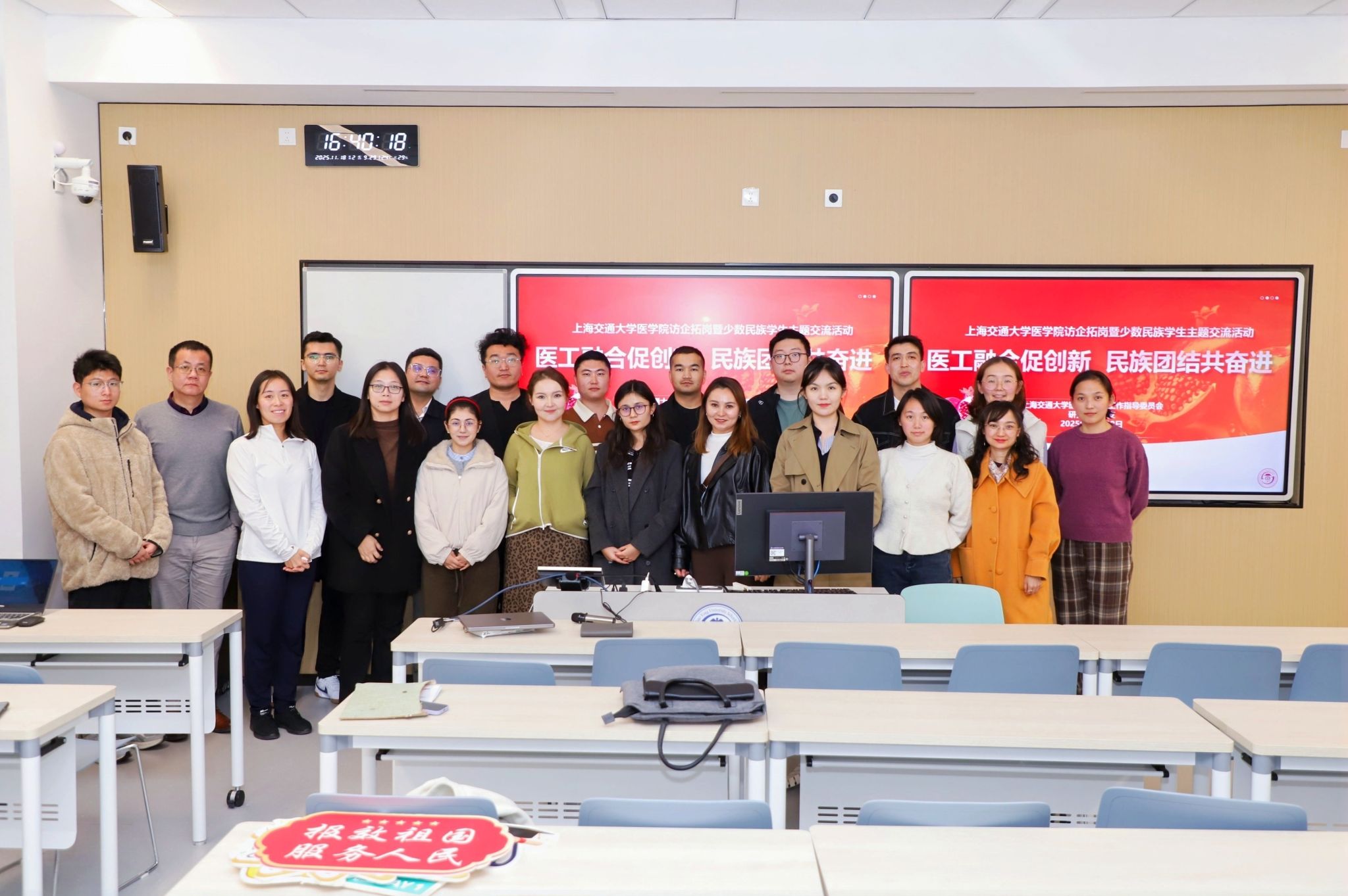 11月18日,学生工作指导委员会成功举办“医工融合促创新,民族团结共奋进”访企拓岗暨少数民族研究生主题交流活动。此次活动是医学院“沪往·疆来”品牌项目的拓展,通过走进前沿企业、参观浦东校区和师生交流三个环节,深化医学院促进民族团结、推动医工交叉和创新人才培育的成果。医学院民族联理事会会长、基础医学院副院长王昊,学指委副秘书长、研究生党总支书记、医学院民族联副秘书长郭莹莹出席,学指委思政教师及少数民族研究生代表近30人参与。活动由2024级瑞金医院外科学博士生哈力木热提·帕尔哈提主持。