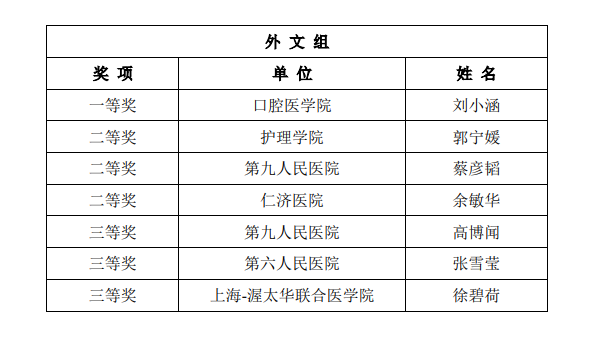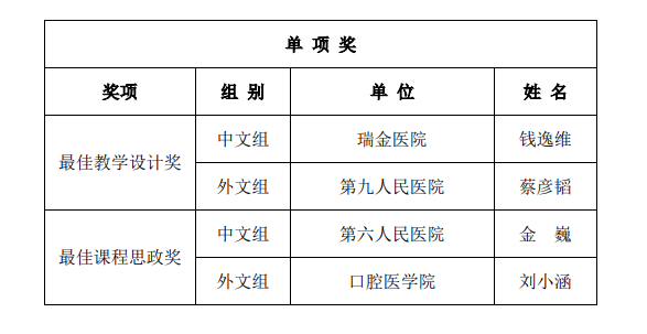 经过紧张而激烈的角逐,最终来自第六人民医院的蔡璇获得中文组一等奖,来自口腔医学院的刘小涵获得外文组一等奖。比赛同时评选出了最佳教学设计、最佳课程思政等单项奖(获奖名单附后)。