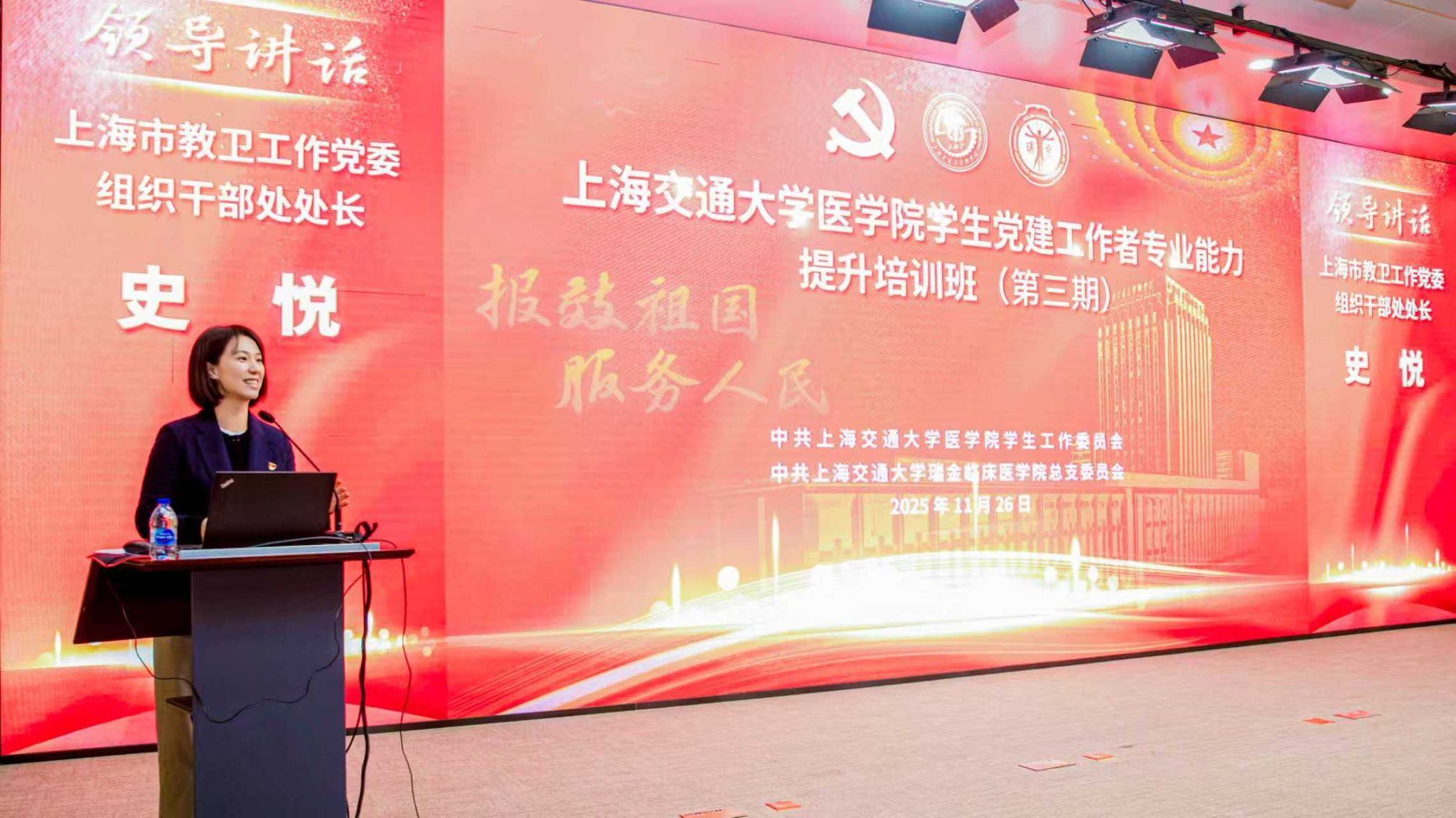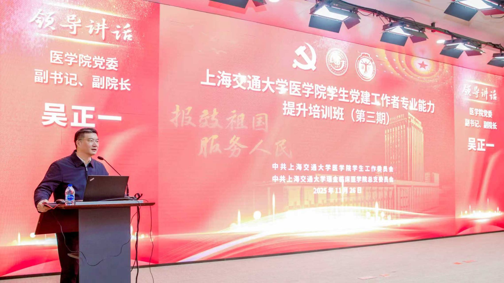 吴正一在讲话中对市教卫工作党委一直以来的支持和指导表示感谢。他指出,交大医学院今年举办学生党建工作者专业能力提升培训班,旨在用习近平新时代中国特色社会主义思想凝心铸魂,深入学习贯彻党的二十届四中全会精神,努力打造一支讲政治高素质专业化的学生党建工作队伍,以高素质党建队伍带动高质量学生党建发展,为党育人、为国育才。吴正一就学生党建工作提出几点要求:一是不断提高政治站位,高度重视学生党员发展和党建工作。大学生党员的数量和质量一定程度上决定了党的执政能力。我们要牢固树立“为科服务、为产育人”导向,紧紧围绕科技发展、国家战略需求和上海城市经济社会发展需要培养具有坚定理想信念的卓越的拔尖医学创新人才。二是不断强化学用结合,加强基层党组织组织力建设。作为学生党建工作者要以“系统思维”统筹资源、创新方法,推动基层党组织从“有形覆盖”向“有效覆盖”升级。三是不断加强工作实践,创建学生党建工作品牌。要整合医学院系统的资源平台,资源共享,优势互补,合作共建。希望各单位结合医学院学生工作实际和学生特点,进一步总结育人规律、挖掘典型经验和特色做法,形成“一院一品”“一支部一特色”的党建矩阵,最终培育出一批立得住、叫得响、推得开的医学院特色党建品牌,为深化上海高等教育改革和全国高校学生党建工作提供“交医样本”。