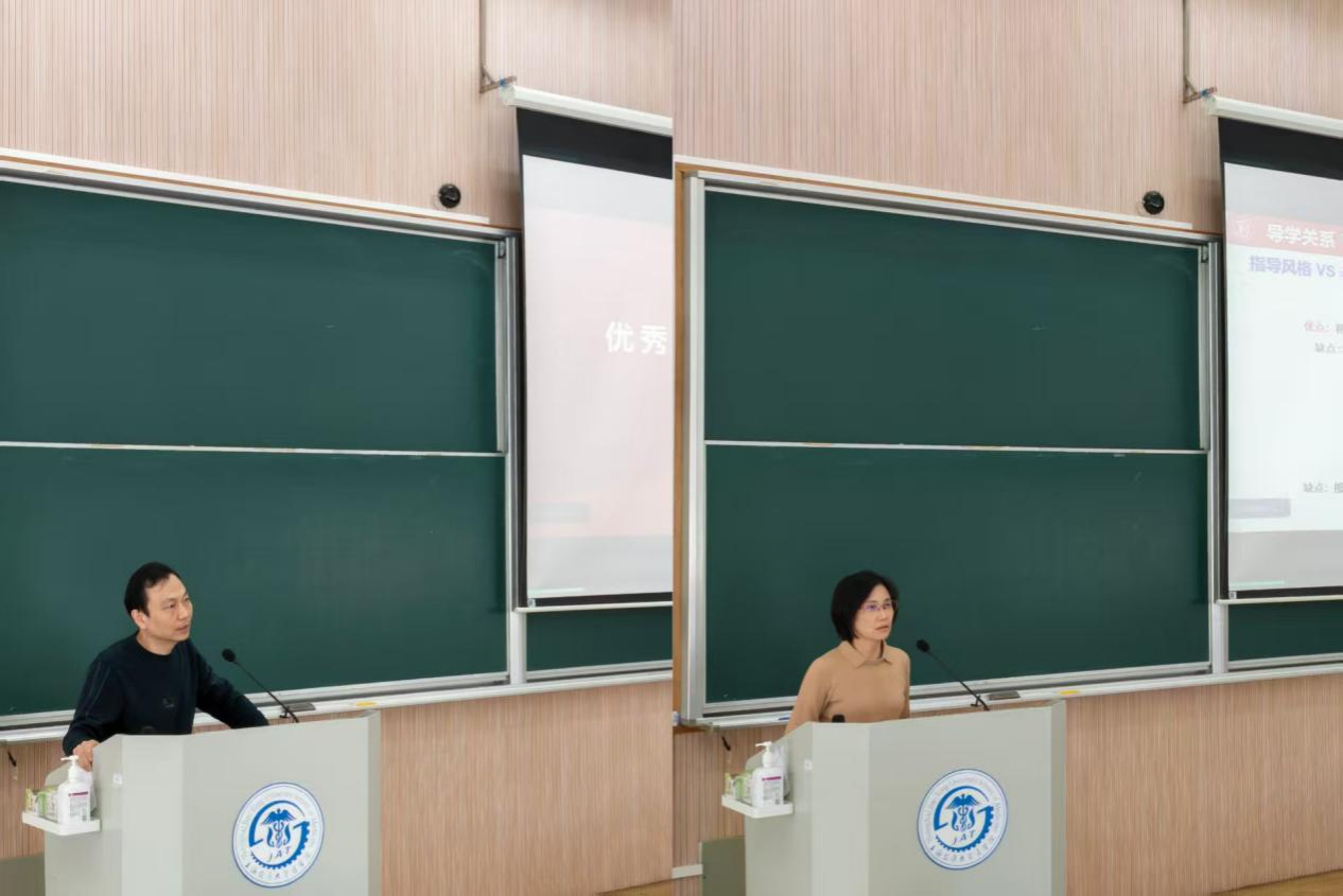 在优秀导师培养经验分享环节,公共卫生学院食品卫生与营养系宋海云研究员和护理学院人文护理教研室朱大乔教授分别作了分享。宋海云老师分享了自己作为导师的切身感受和师生共处的经验。他强调要尽早让学生接触课题,定期与学生交流课题进展,真正把导师作为研究生培养第一责任人的制度落到实处;朱大乔老师结合自身多年教学、科研以及研究生培养经验,从研究生导学关系类型理论的角度展开,为在场老师们建立适合自己的师生关系模式和指导风格提供参考依据。