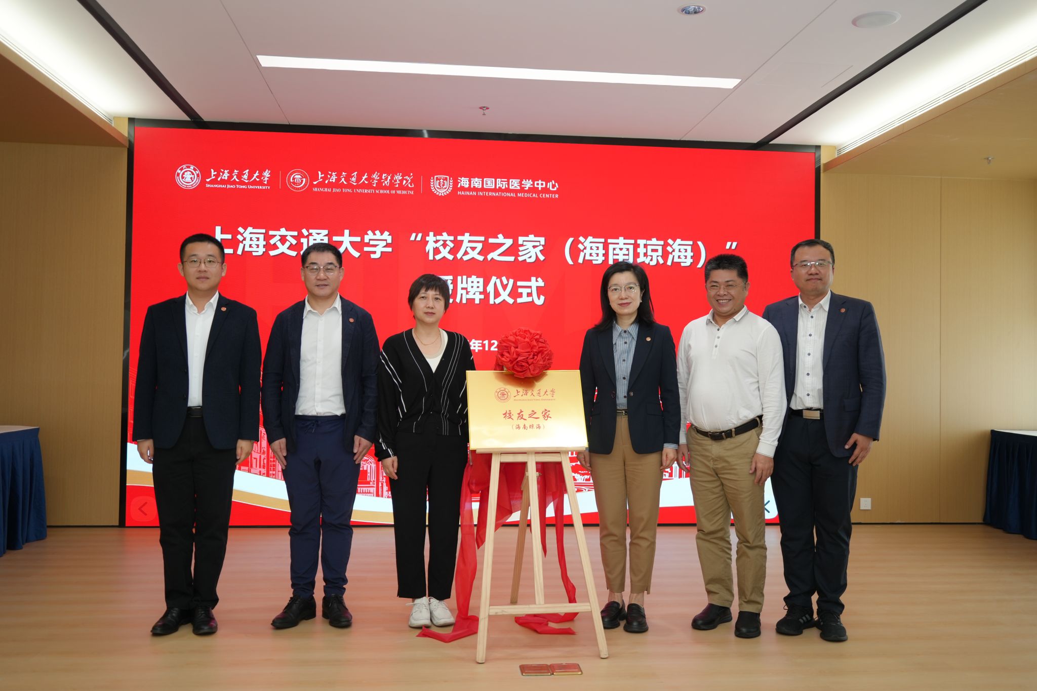 胡薇薇、顾希垚、童天朗、上海交通大学海南研究院院长李欣、专职副院长陈哲、海南校友会会长王会丰共同为上海交通大学“校友之家(海南琼海)”揭牌。