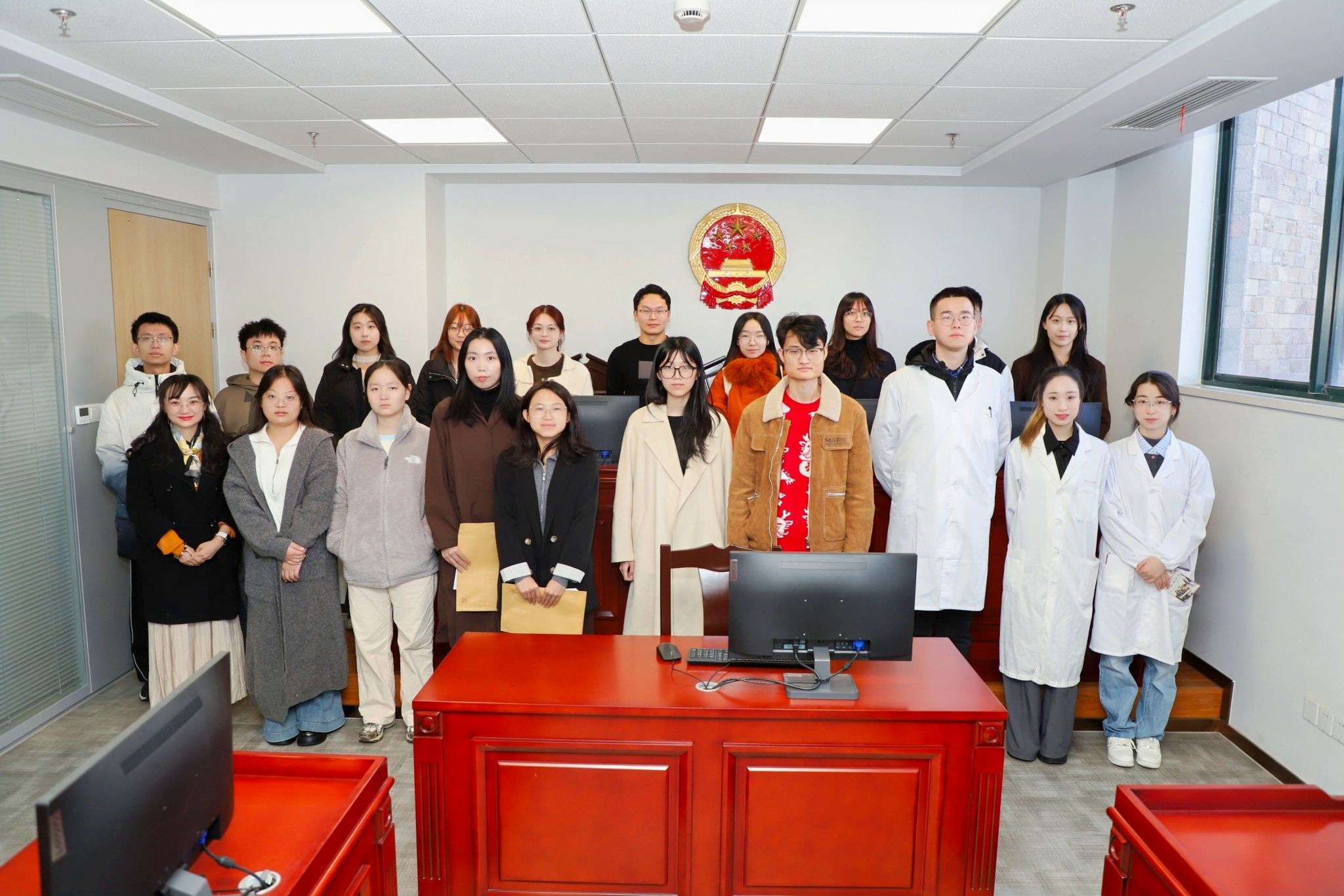 医学院一行在凯原法学院师生的引导下参观了慧谷模拟法庭,凯原法学院陈品臻同学详细介绍了法庭布局的象征意义、庭审流程的核心环节,重点解读了医疗纠纷案件中举证责任倒置、病历作为“证据之王”的重要性等专业要点。通过实地参观与情景体验,医学生们直观感受了司法的庄严与公正,对医法交叉领域的实践场景有了更深刻的认识。