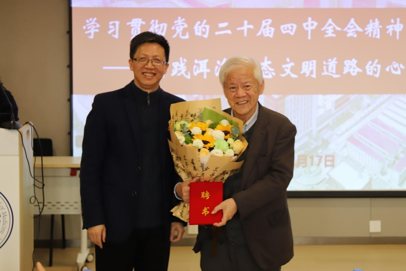 随后,章新代表学院向孔海南颁发大公卫思政与医学人文教育基地导师聘书,青年教师代表敬献鲜花,现场响起热烈掌声。这一仪式充分体现了学院党委对思政育人工作的高度重视和前瞻布局,也标志着学院在构建“大思政”育人格局、推动医学人文教育与专业教育深度融合方面迈出坚实一步。