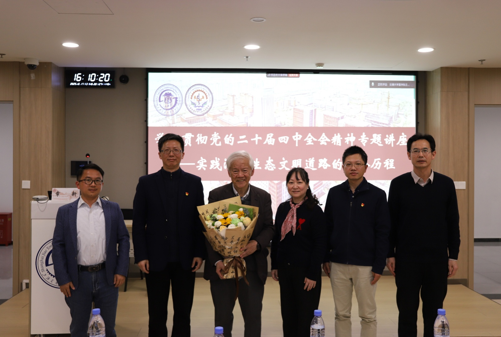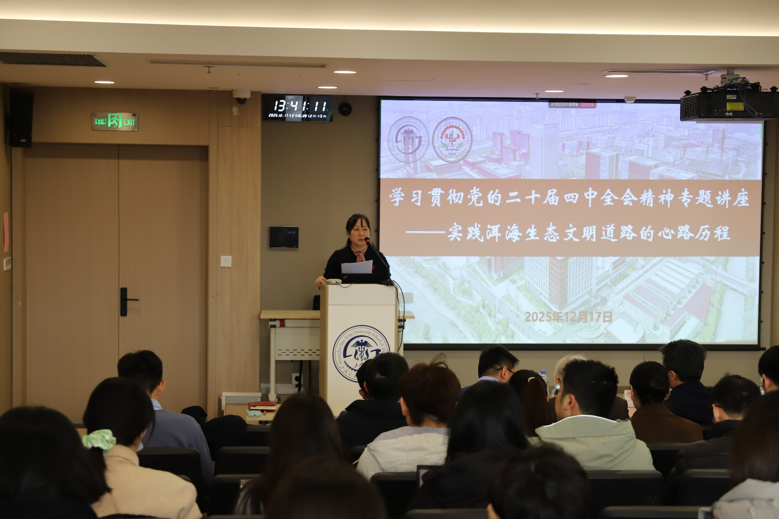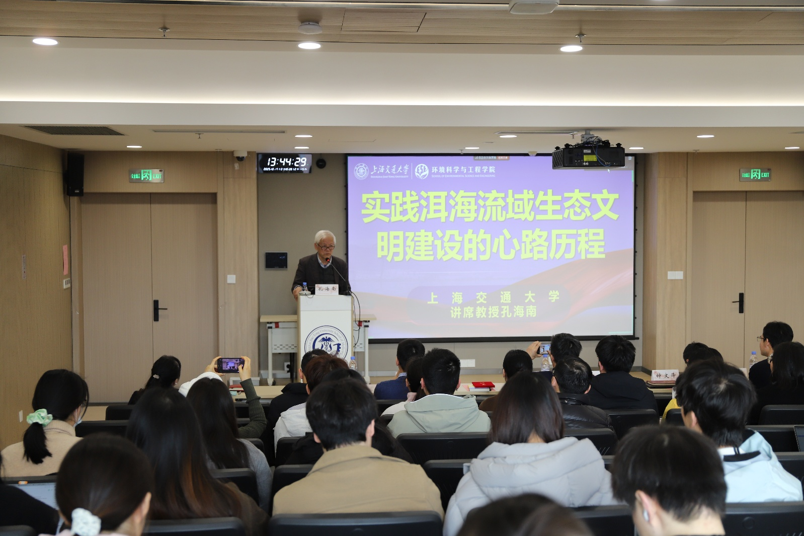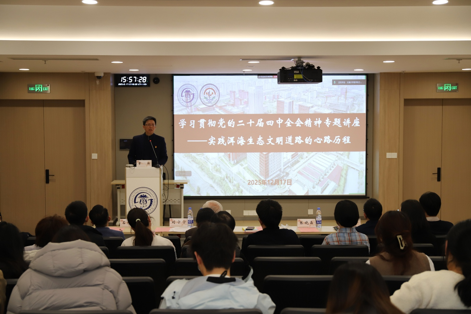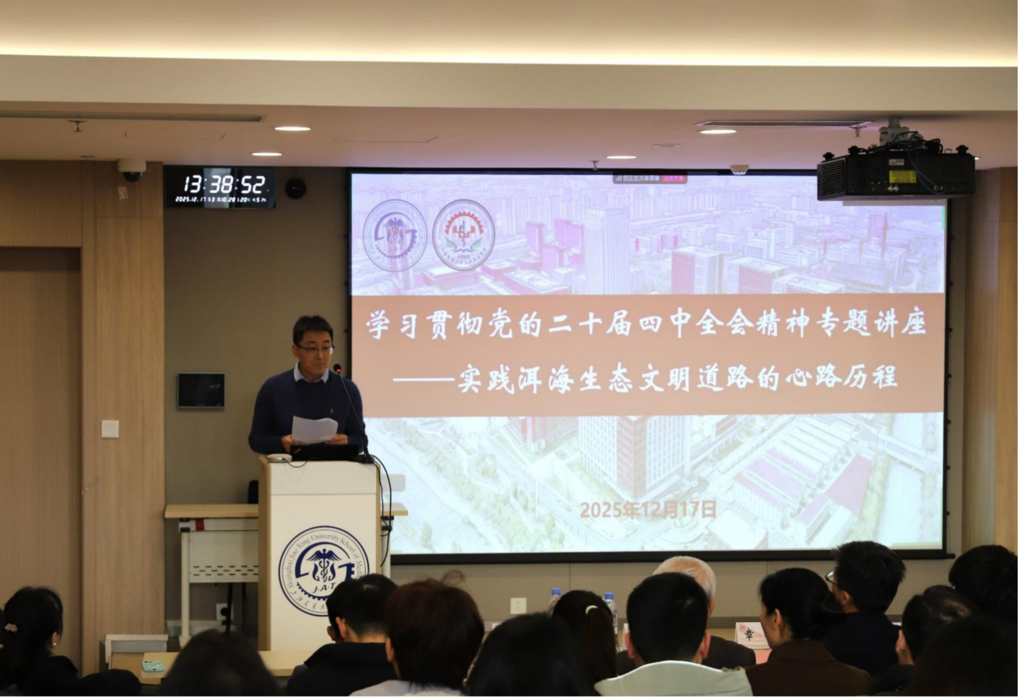 12月17日下午,上海交通大学医学院公共卫生学院在浦东校区东11-D303学术报告厅隆重举办“学习贯彻党的二十届四中全会精神专题讲座:实践洱海生态文明道路的心路历程”。本次讲座特邀国家水体污染控制与治理科技重大专项洱海项目负责人、上海交通大学环境科学与工程学院讲席教授孔海南主讲。医学院党委教师工作部副部长刘宁宁,公共卫生学院党委书记章新、公共卫生学院副院长钟文泽等领导出席,学院挂职干部、党支部支委、入党积极分子、关工委委员等师生代表也参加了本次活动。讲座旨在深入学习领会党的二十届四中全会关于生态文明建设的战略部署,通过洱海治理的生动实践汲取宝贵经验,深化对绿色发展理念的理解,激励师生投身美丽中国与健康中国建设。活动由公共卫生学院党委副书记张晓晶主持。