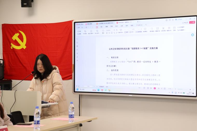 随后,张帜通报了党支部拟推出的“党群联系1+1制度”实施方案。该制度通过运行“联系学生”与“联系实事”双轨机制,组织研究生党员与本科生结对,引领其尽早熟悉专业;同时以学生党员为主体,建立公卫就业信息库,深化与公卫行业单位的联动,结合学科特色开展实事项目。目标是搭建常态化机制化沟通桥梁,及时掌握师生思想动态与实际困难,精准传递组织关怀与政策信息。