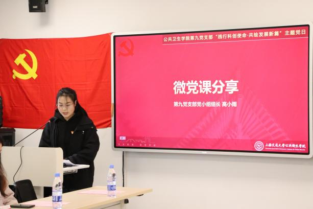 在“微党课”分享环节,高小雨围绕“学习习近平总书记考察上海重要讲话精神,推进上海国际科技创新中心建设”主题进行导学。她以公共卫生专业视角为切入,深刻阐述了专业学习必须紧扣城市发展与人民健康需求的核心要义,青年党员要主动融入国家战略,面向大健康相关前沿领域,将个人发展融入健康中国和上海国际科技创新中心建设大局。
