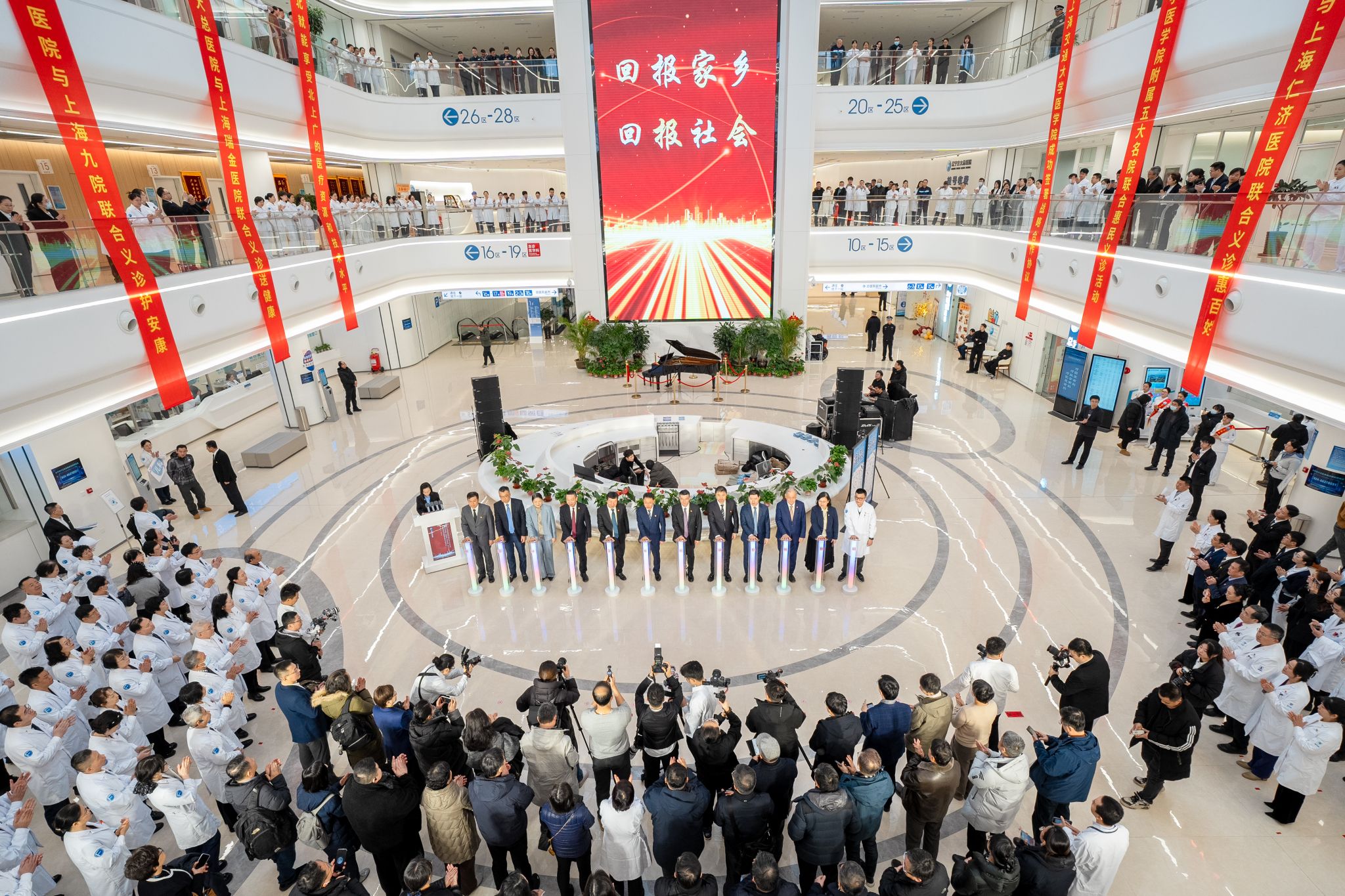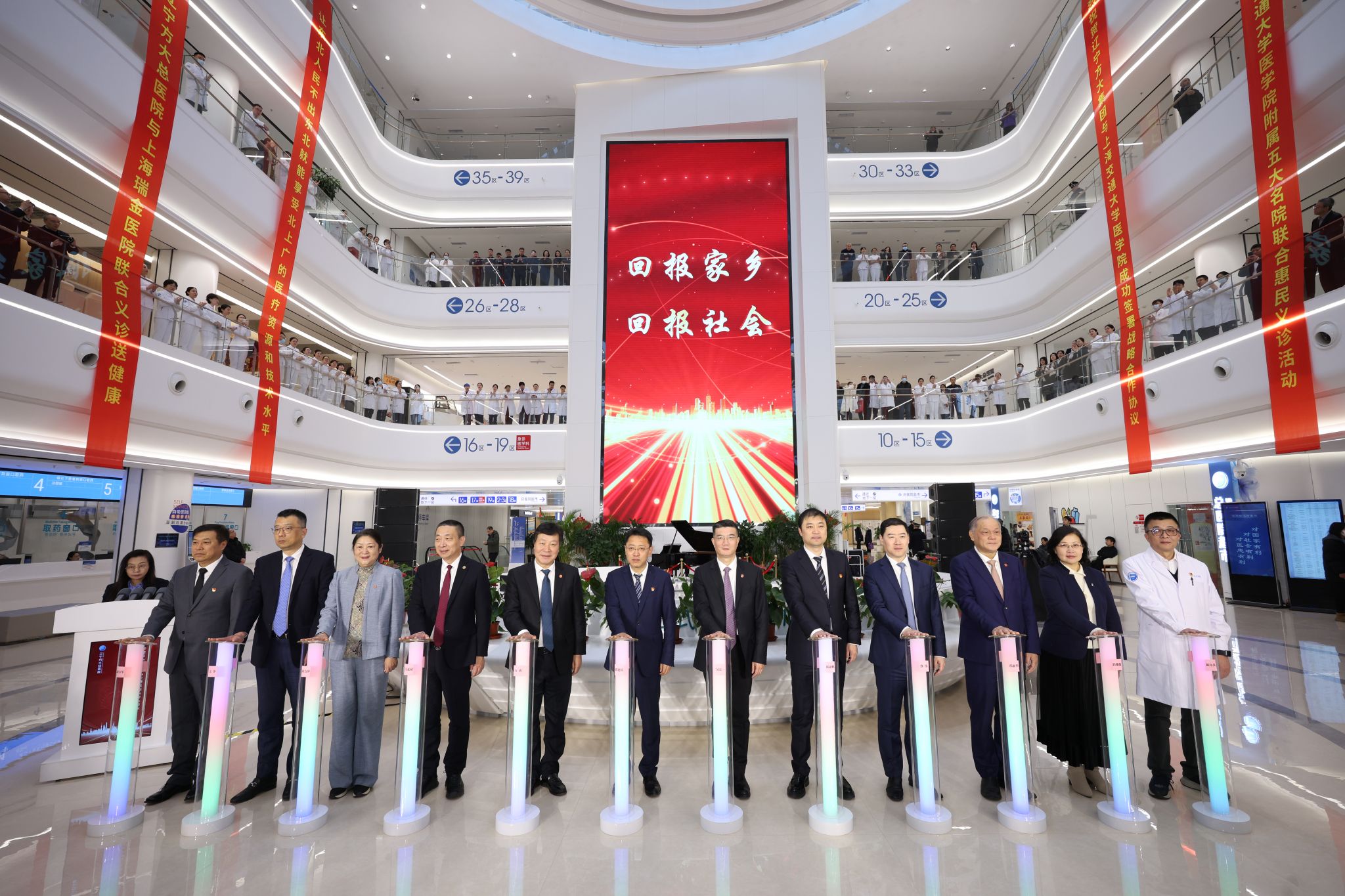 上海交通大学医学院党委副书记、副院长吴正一、副院长方勇、医院管理处处长邵新华、发展联络处副处长倪黎冬,附属第九人民医院党委书记马延斌、附属新华医院院长蔡伟、附属瑞金医院副院长邱力萍、附属仁济医院副院长王争、附属上海儿童医学中心副院长郭薇薇、辽宁方大集团董事、高级副总裁郭建民、辽宁方大集团董事、高级副总裁邱亚鹏、辽宁方大总医院董事长康万军、院长陈尔真以及5家附属医院医务处(部)负责人和辽宁方大总医院医护人员代表共同出席了义诊活动启动仪式。仪式由辽宁方大总医院党委书记、集团董事局主席助理詹柏丹主持。