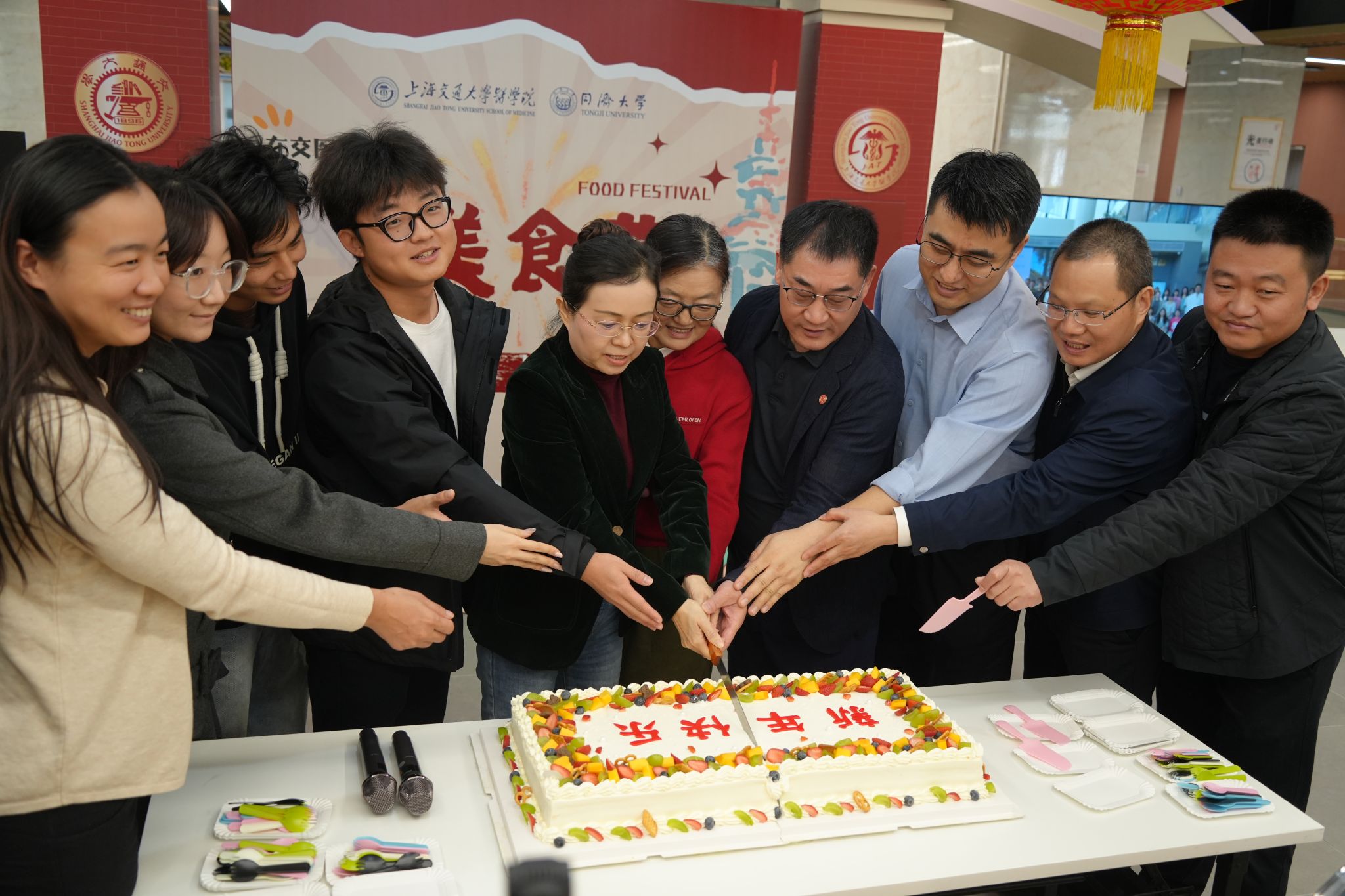 嘉宾共同切蛋糕庆祝,标志着美食活动正式启动。